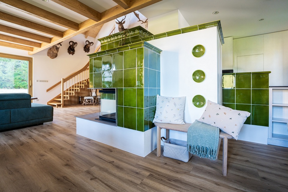 Kachlová kamna, citlivě začleněná do dispozice, propojují kuchyň, jídelnu, obývací prostor i otevřené atrium s galerií v patře. Navzdory tomu, že jde o technicky mimořádně náročnou stavbu, působí v interiéru přirozeně a harmonicky.