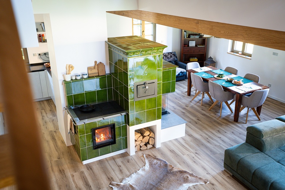 Použití dvou ohnišť značky Ortner – rohového kamnového a bezroštového sporákového – není v kamnářském odvětví obvyklé. Propojením výrazné hmoty kamen s praktickou plotnou vznikl celek, který odkazuje na venkovskou tradici vaření, ale zároveň splňuje nároky moderního domu.