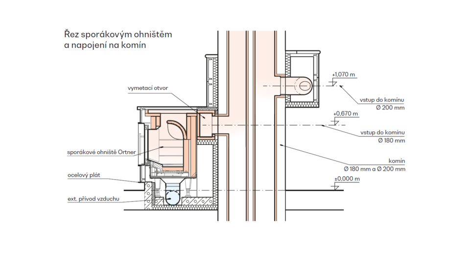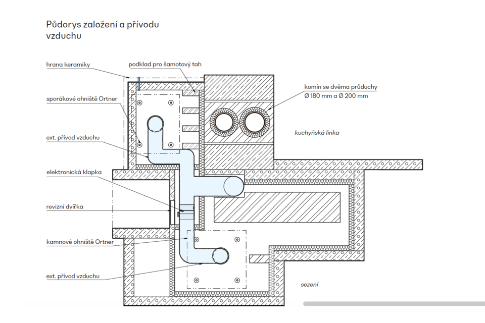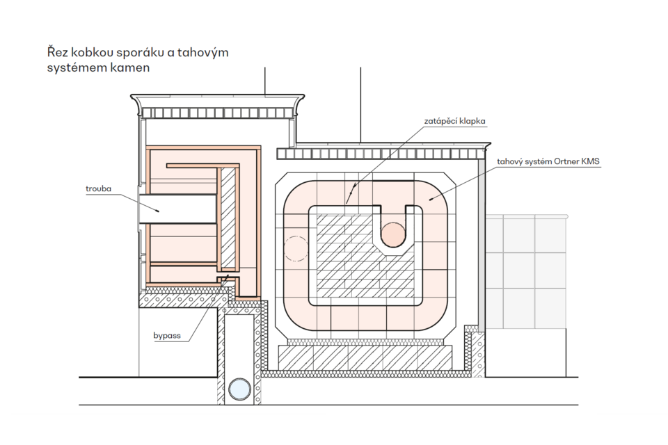 Největší technickou výzvou byla práce s prostorem a umístěním dvojkomína sevřeného mezi nosnými prvky monolitického stropu. Sporáková část má netradičně vyvedený sopouch v úrovni ohniště – spaliny tedy nejprve stoupají nad troubu a poté se vracejí zpět pod úroveň plotny. Takové řešení nebývá běžné, a proto vyžadovalo precizní projekt i provedení.