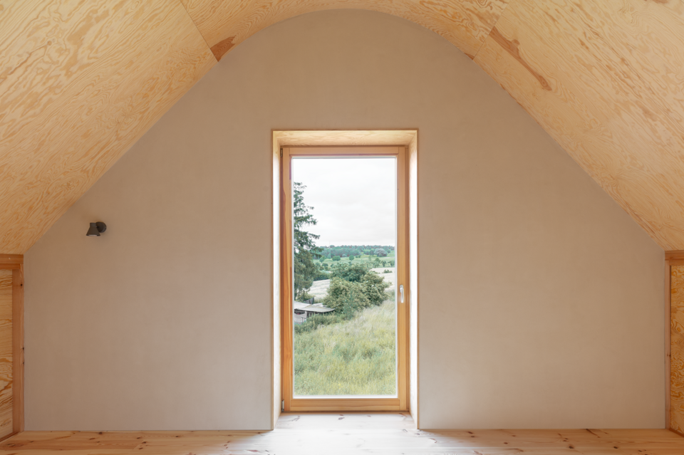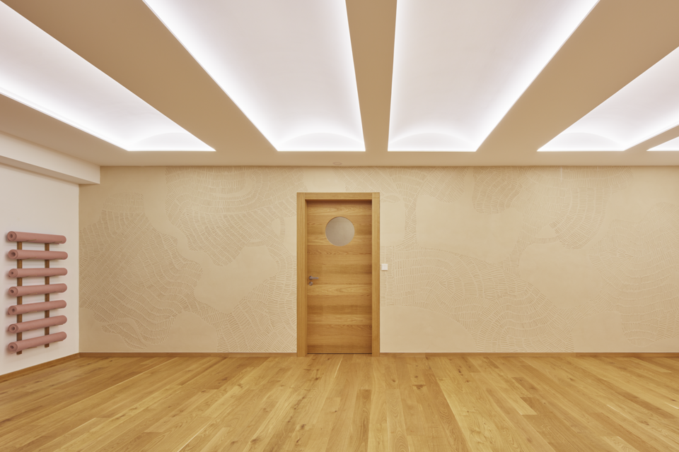Druhou, povrchovou vrstvu tvoří štuková omítka v tloušťce 2–3 milimetry. Tato vrstva je konečná a již se nepřekrývá žádnou malbou. Štuková omítka se na rozdíl od jádrové vyrábí převážně z kaolinitických jílů a jejím úkolem je být maximálně prostupná, ale zároveň povrchově pevná a pro investora vizuálně atraktivní. Způsobů, jak její povrch zpevnit, existuje více; my jsme zvolili spojení hlíny s bylinami. Štuk je díky tomu nejen pevnější, ale také si zachovává vysokou paropropustnost (μ = 3,3–6,2) a maximální pórovitost pro útlum hluku.