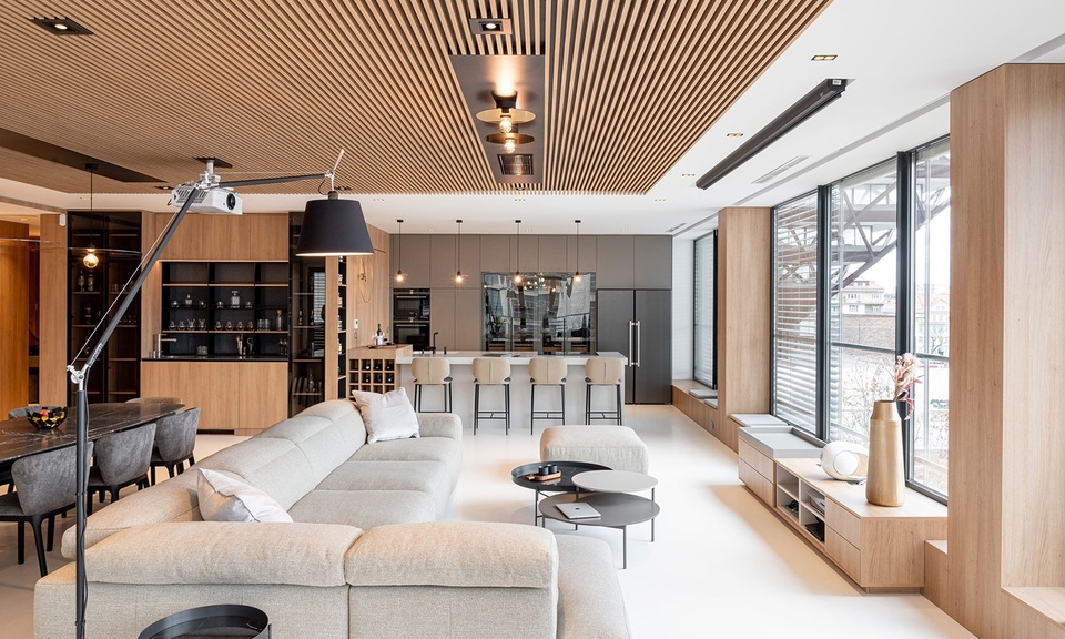 Interiéry, které kladou důraz na funkční dispozici, adaptabilitu vůči potřebám klienta a kvalitní materiály, jsou ukázkou synergie designu a architektury. V prostředí, kde nadstandardní adresa a výhled na ikonu moderní architektury určují rámec projektu, je výsledek o to výjimečnější.