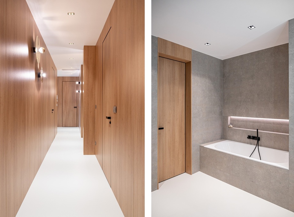 „Minimalistické pojetí interiéru se výrazně projevilo ve všech místnostech, zejména v členité chodbě,“ poznamenává Andrej Gajdoš, jeden ze spoluzakladatelů ateliéru SAGA, a dodává: „Použili jsme sofistikovaný obkladový systém EFEKTA od firmy JAP FUTURE, který umožnil opláštit stěny v dřevěném dekoru a zároveň do něj včlenit dveře s nadstandardní výškou ve stejném dekoru. Dveře MASTER ve skryté zárubni tak lícují s obkladem a vytvářejí čistou rovinu.“