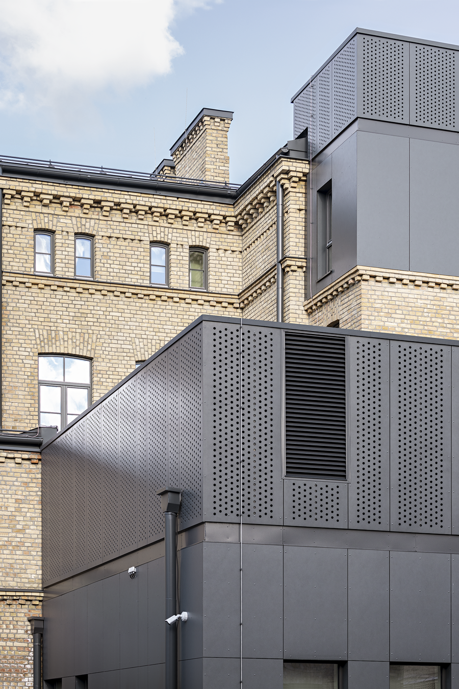 Nejvýraznějším prvkem přístavby je fasáda tvořená vláknocementovými deskami Swisspearl Largo Carat Black Opal 7021 (dnes 8021). Její horní část je realizována z perforovaných panelů, které hmotu přístavby odlehčují a vytvářejí hru světla a stínu. Tmavě šedá barva materiálu představuje ve spojení s historickou cihlou zajímavý kontrastní prvek. Staré a nové však dohromady nevytváří napětí, ale harmonický celek, kde se obě části vzájemně doplňují. Historická hmota, reprezentující tradici, si zachovává autenticitu, zatímco přístavba díky perforaci a minimalistickému provedení působí lehce a moderně.