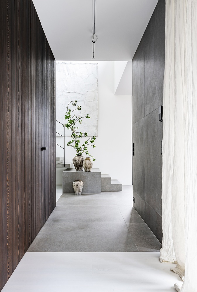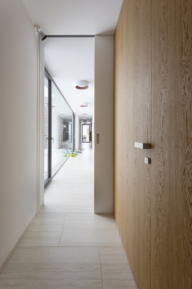 Z architektonického hlediska patří mezi klíčové prvky skryté zárubně, které umožňují vnímat pouze tenkou, přibližně třímilimetrovou spáru mezi křídlem a stěnou. Takto čistý detail ale funguje jen při důsledném řešení všech návazností. Proto firma vyvinula také systém skrytého soklu LINUS, jenž zachovává rovinu stěny až k podlaze bez vystupujících lišt.
