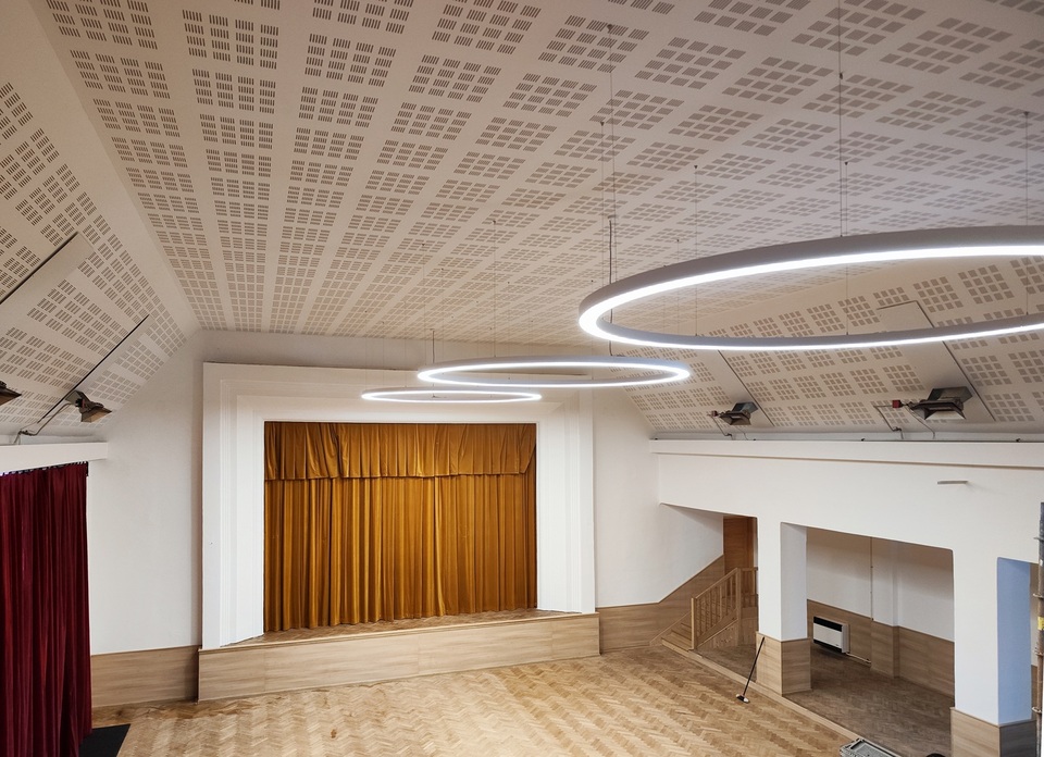 V kulturním domě v Brumovicích v okrese Opava proběhla letos rozsáhlá modernizace, která významně zlepšila akustiku, zvýšila bezpečnost i komfort návštěvníků a přinesla profesionální zázemí pro kulturní život obce. V hlavním sále byl instalován akustický perforovaný podhled doplněný minerální vatou, který vyrovnává průběh doby dozvuku. Na stěně naproti pódiu a na balkoně byl použit pohltivý akustický obklad, jenž eliminuje nežádoucí odrazy zvukové energie směrem k jevišti. Stěna s okny byla doplněna akustickým závěsem, korigujícím zvukové pole na vyšších kmitočtech. Rovněž zde bylo instalováno nové scénické osvětlení a nové silnoproudé rozvody.