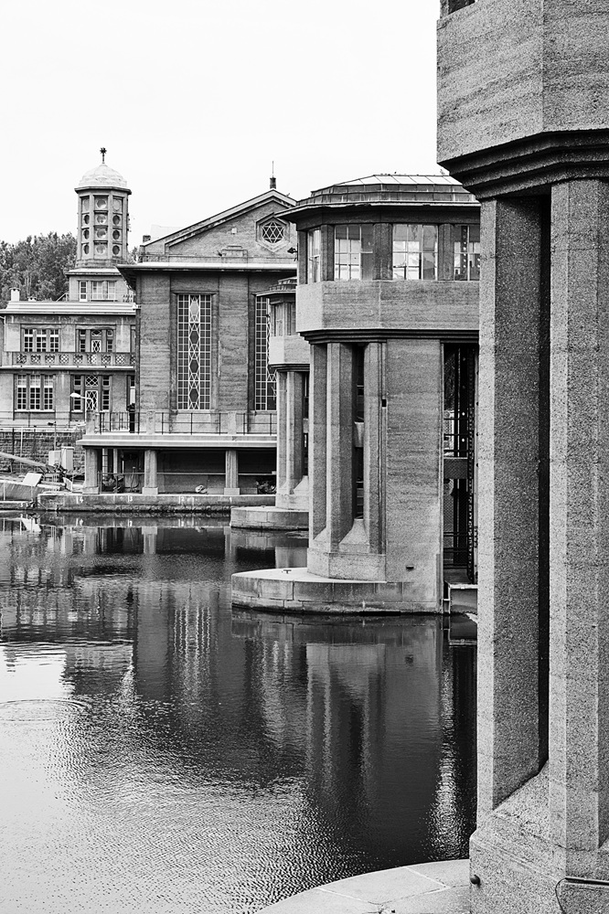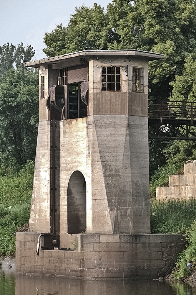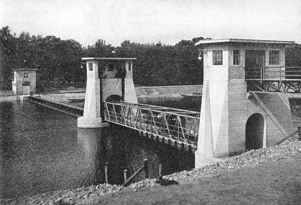 Pro splavnění středního Labe od Mělníka po Jaroměř vypsalo roku 1906 vídeňské Ředitelství vodních cest veřejnou soutěž na novou konstrukci pohyblivého říčného jezu, spolehlivě ovladatelného i v zimě.3 Tehdy užívané slupicové jezy se totiž musely rozpojovat a sklápět ke dnu už s prvními mrazy, ačkoli plavba mohla ještě pokračovat a mlýny a vodní elektrárny pracovat až do příchodu velkých ledových ker. Soutěž nepřinesla optimální řešení a pro první dvě zdymadla u Mělníka a Obříství, nacházející se shodně v obloucích říční trati, nakonec v roce 1907 Ředitelství vodních cest zkombinovalo systémy dva: mělkou, vnější část profilu přehradilo lehkým sklopným slupicovým jezem Eduarda Schwarzera a hlubší, určenou k plavbě, jezem Willibalda Liebische, jehož hradicí těleso je zavěšeno na mostní konstrukci, svisle posuvné mezi vysokými pilíři zakončenými strojovnami jeřábů, které ji v celku zvedají až nad úroveň velké vody. A právě tyto pilíře, čnící osm metrů nad labskou hladinou, byly onou Engelem zmiňovanou bezprecedentní stavbou, jejíž „nový účel vyžaduje i nového tvaru“.