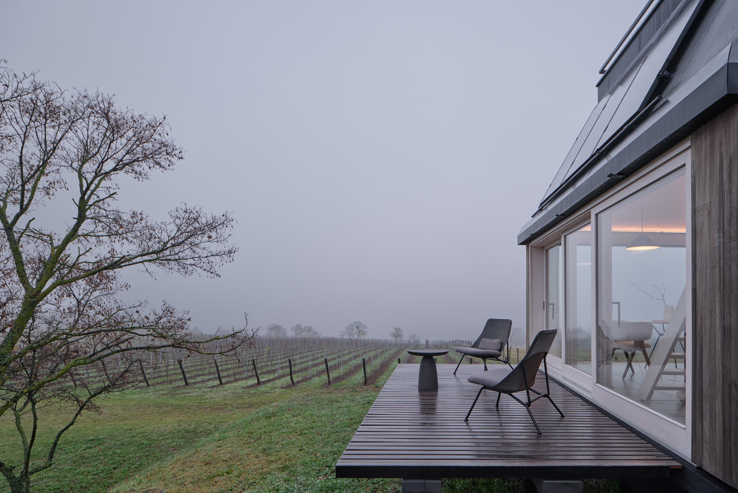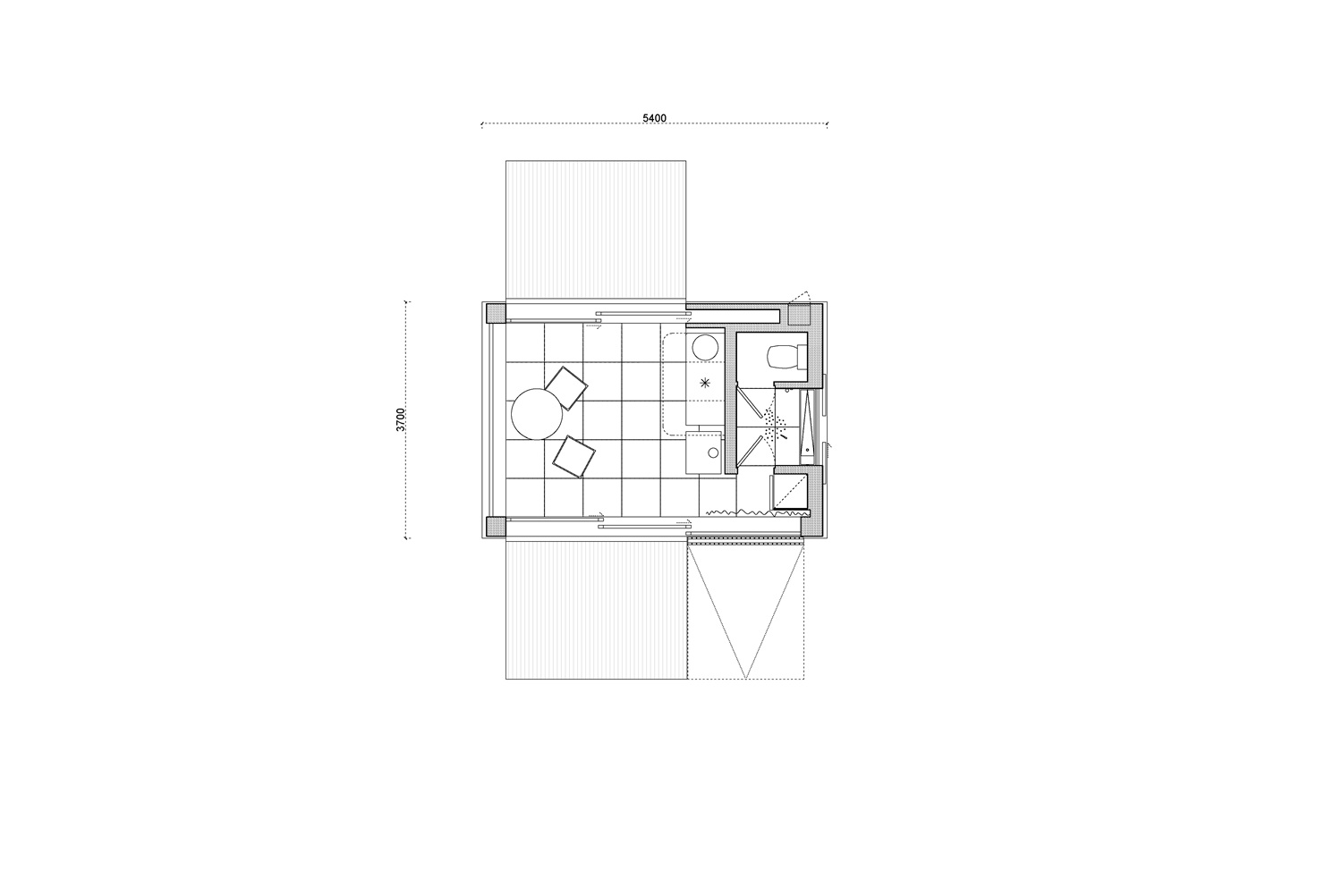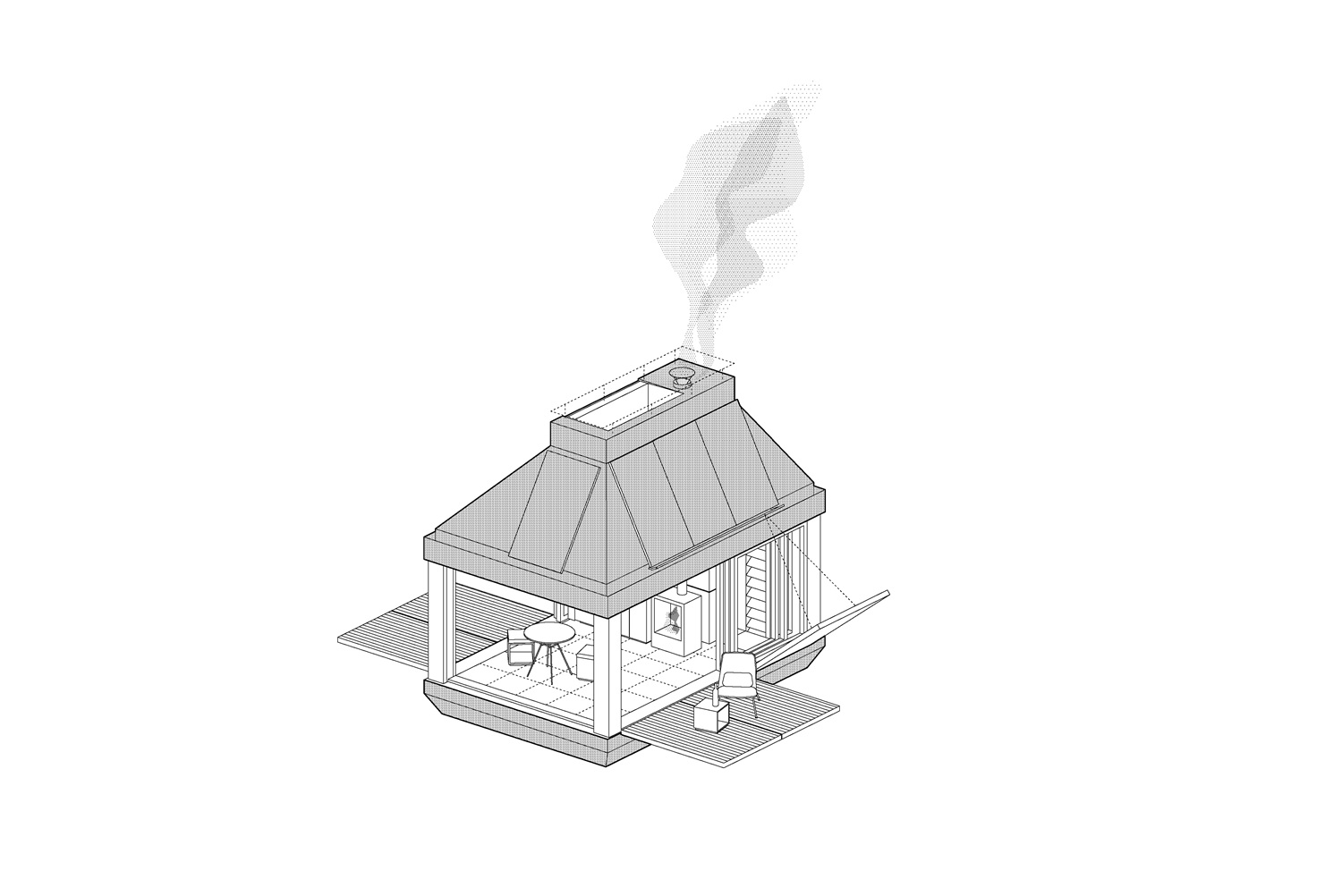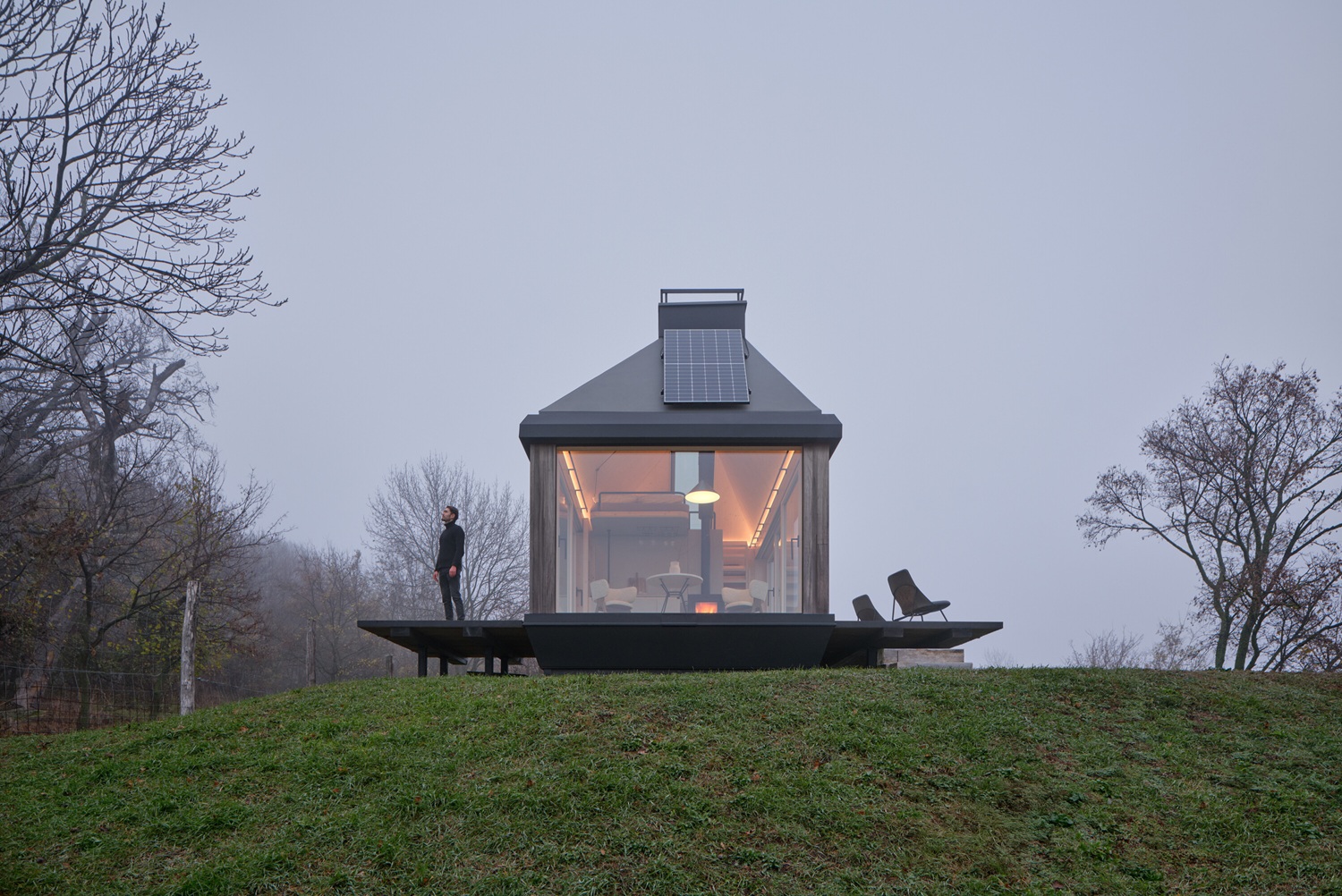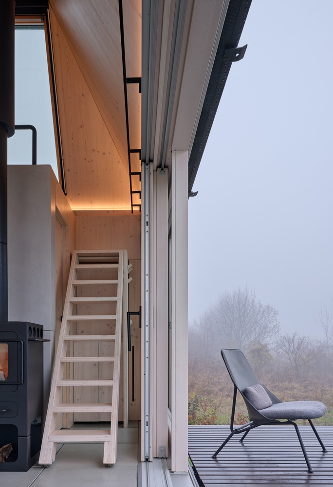 Objekt reaguje na výhled maximálním otevřením. Dvě strany domku jsou otevíravé pomocí sklopných teras, které po vyklopení odhalí posuvné skleněné stěny. Přední stínění skrývá celoplošné zasklení čelní stěny. Většina času se odehrává právě v prostoru mezi těmito otvory. Po jejich otevření se interiér rozšíří o terasy na obou stranách a užitná plocha se opticky i funkčně znásobí. Interiér tak není oddělen od exteriéru, ale plynule s ním spolupracuje.