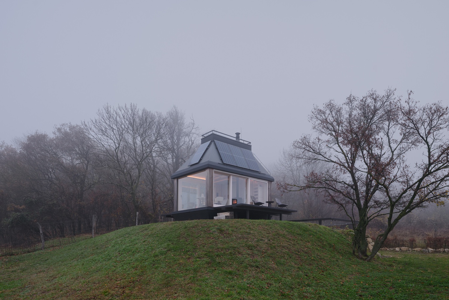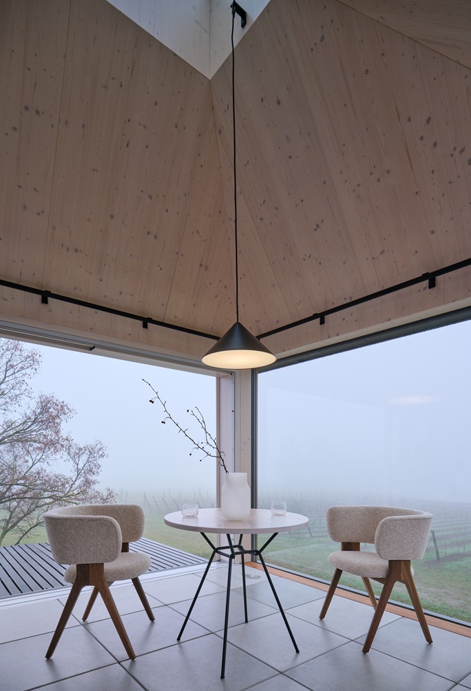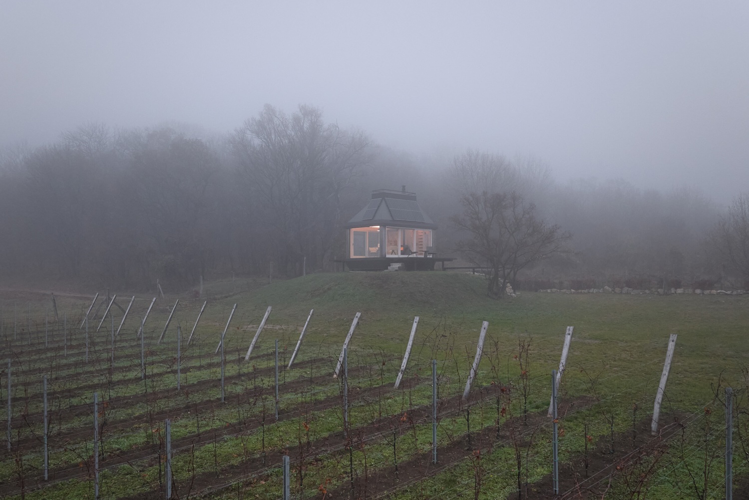 Zadáním bylo navrhnout na ploše 20 metrů čtverečních plnohodnotné víkendové obydlí bez kompromisů na úkor komfortu a současně zajistit jeho naprostou energetickou soběstačnost. Objekt stojí na konci pozemku vinařství Zlatý Roh, přibližně tři kilometry nad restaurací ECK. Poloha vysoko nad hradem Děvín nabízí jedinečný výhled přes vinice na západ slunce nad rakouským pohořím. Samo místo má silnou atmosféru, a proto bylo záměrem architektů navrhnout objekt tak, aby poskytoval bezpečí v každém ročním období a zároveň zůstal v neustálém kontaktu s krajinou.