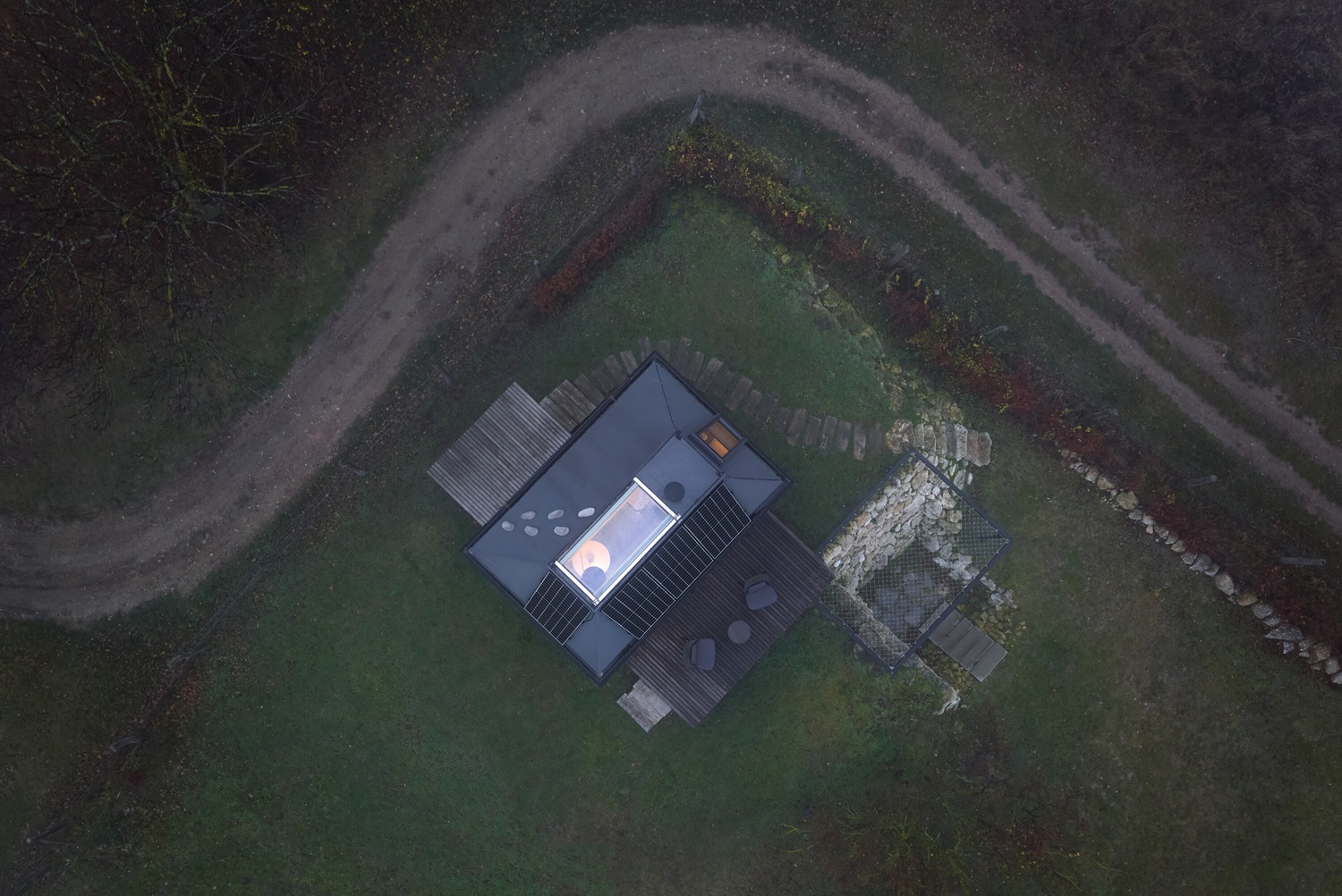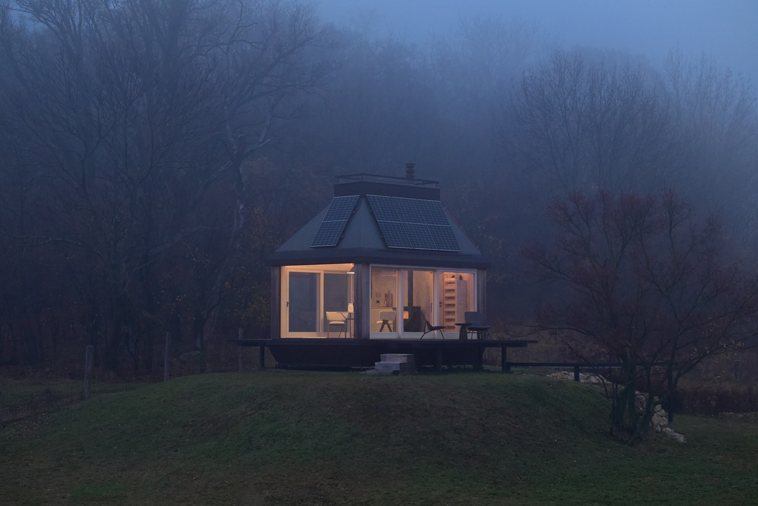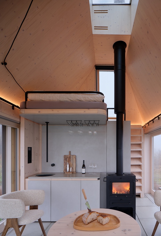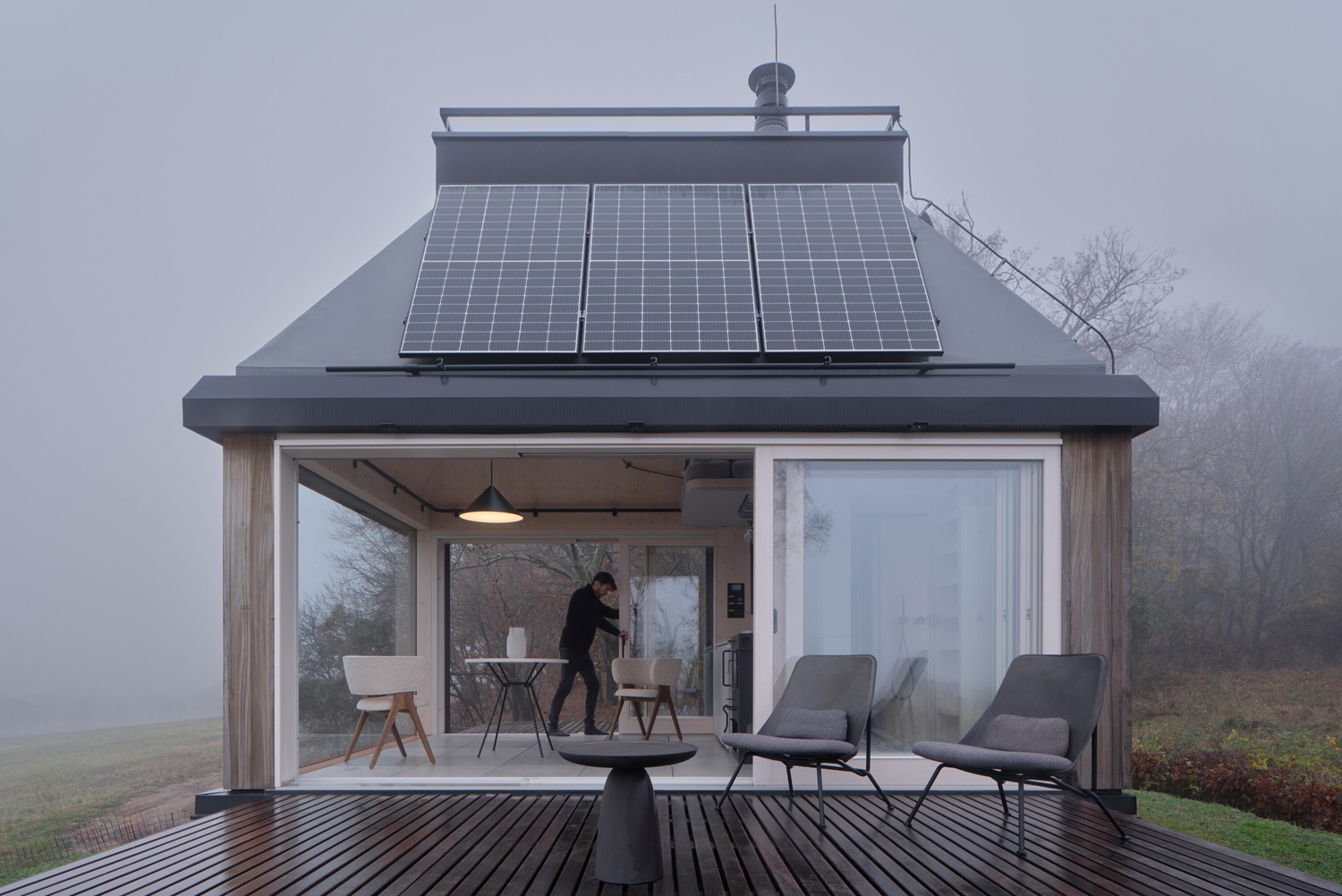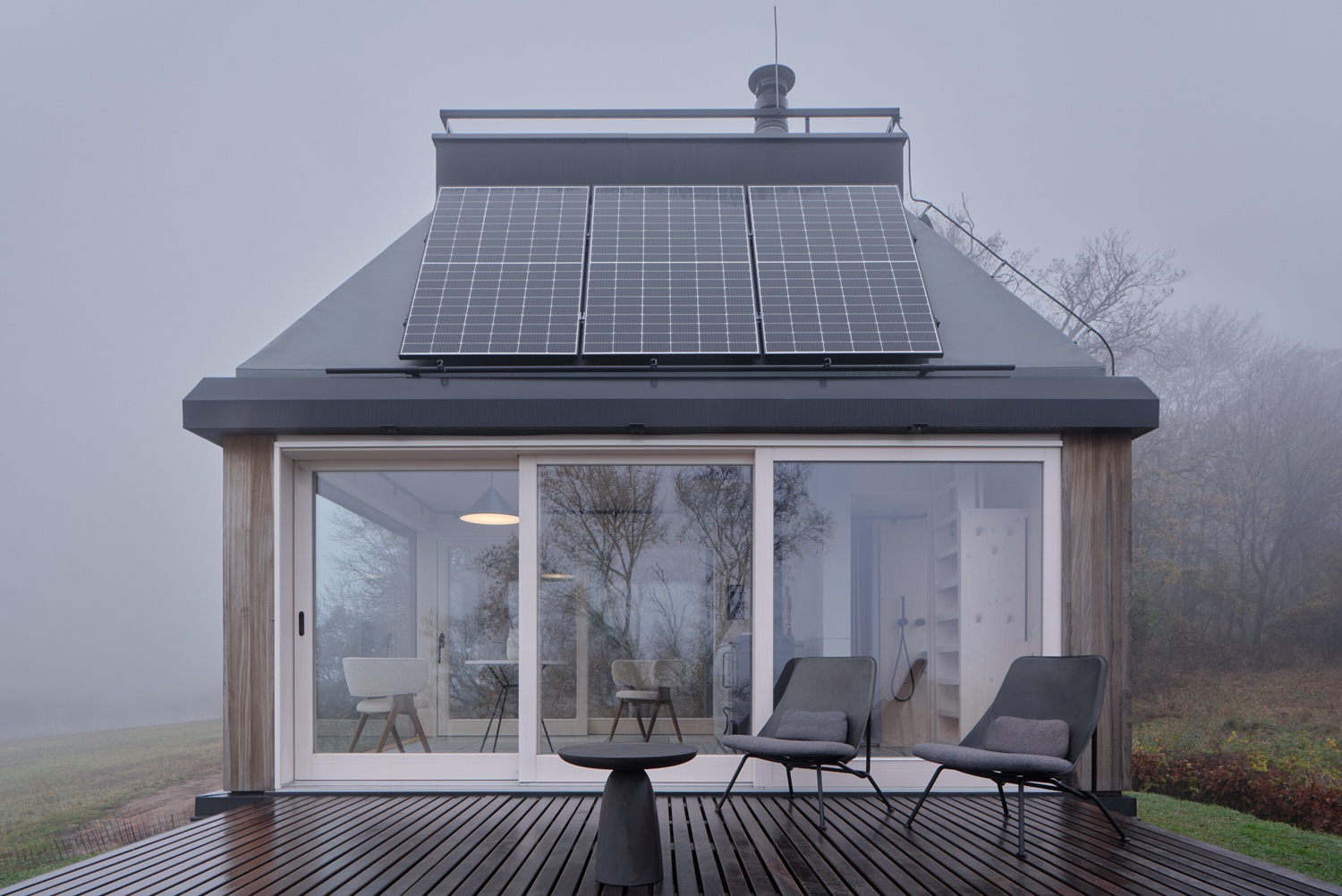 Cabin je od okolního světa oddělen nejen pocitově, ale také technologicky. Funguje jako off-grid objekt během všech ročních období bez omezení komfortu. Energetická koncepce kombinuje solární panely s bateriovým úložištěm a plynovými bombami. Hybridní spotřebiče automaticky přepínají z elektrické energie na plyn v momentě, kdy kapacita baterie klesne pod nastavenou úroveň. Elektřina zůstává prioritně pro osvětlení a drobná zařízení, zatímco energeticky náročnější procesy, jako ohřev vody, topení či chlazení, se flexibilně přizpůsobují dostupnému zdroji.