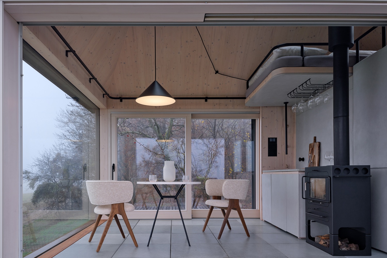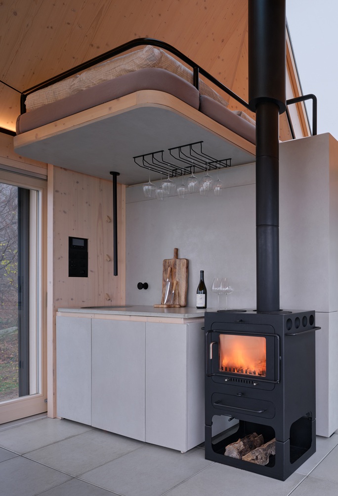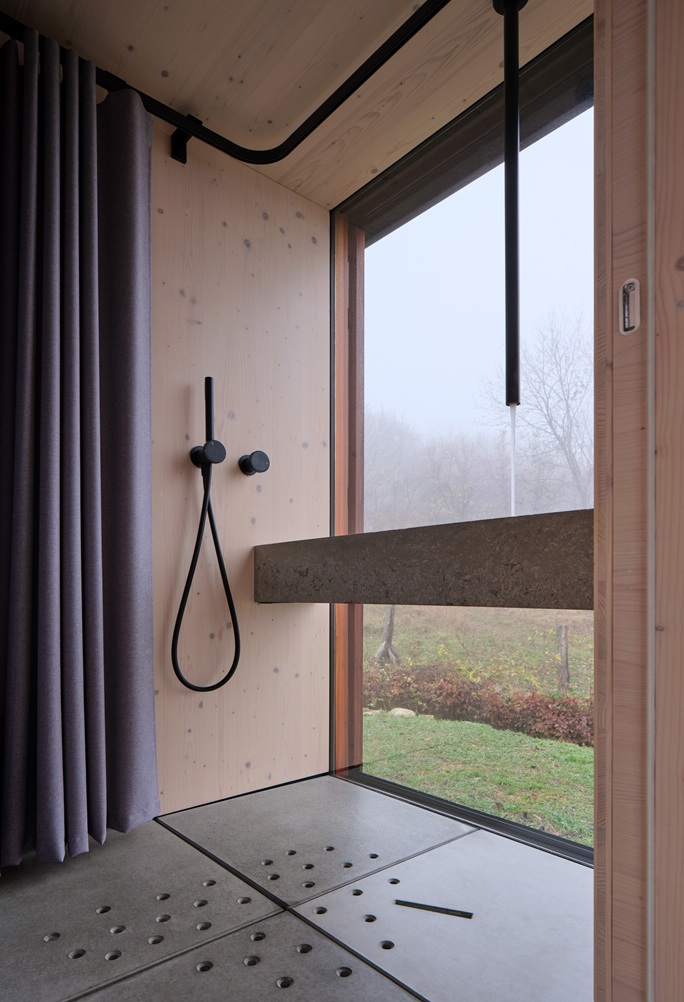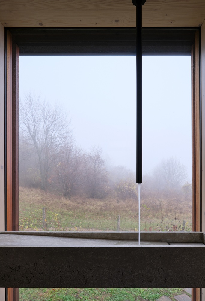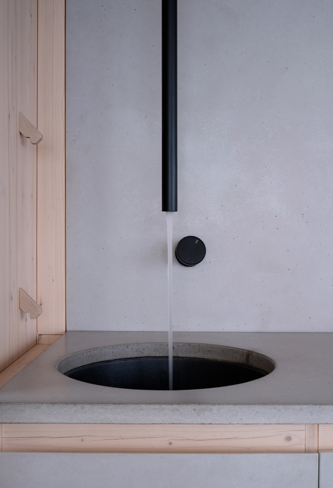 Za zády hlavního pobytového prostoru je situována kompaktní kuchyňská linka a za ní koupelna se sprchou. Betonové umyvadlo osazené přímo v okně směřuje pohled do lesa. Tento moment zpomaluje ranní rituál a propojuje každodennost s přírodou.