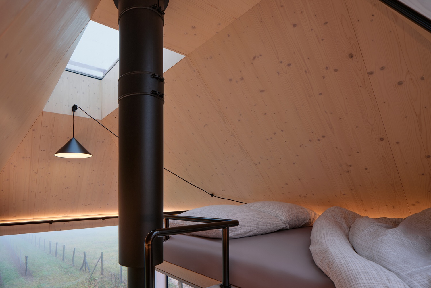 Večer nastává transformace. V interiéru visí lampa, jejíž kabel sahá až z podkroví. Po vytáhnutí se lampa začne zvedat a odhalí prostor na spaní, který během dne zůstává skrytý. Schodiště je zasunuto ve skříni a působí jako regál, objeví se až v momentě potřeby. Podkroví má kontrastní atmosféru – místo prosklených stěn ho chrání hutný plášť střechy, jenž uživatele uzavírá do intimního prostoru. Nad hlavou zůstává jen stropní světlík určený k pozorování hvězd.