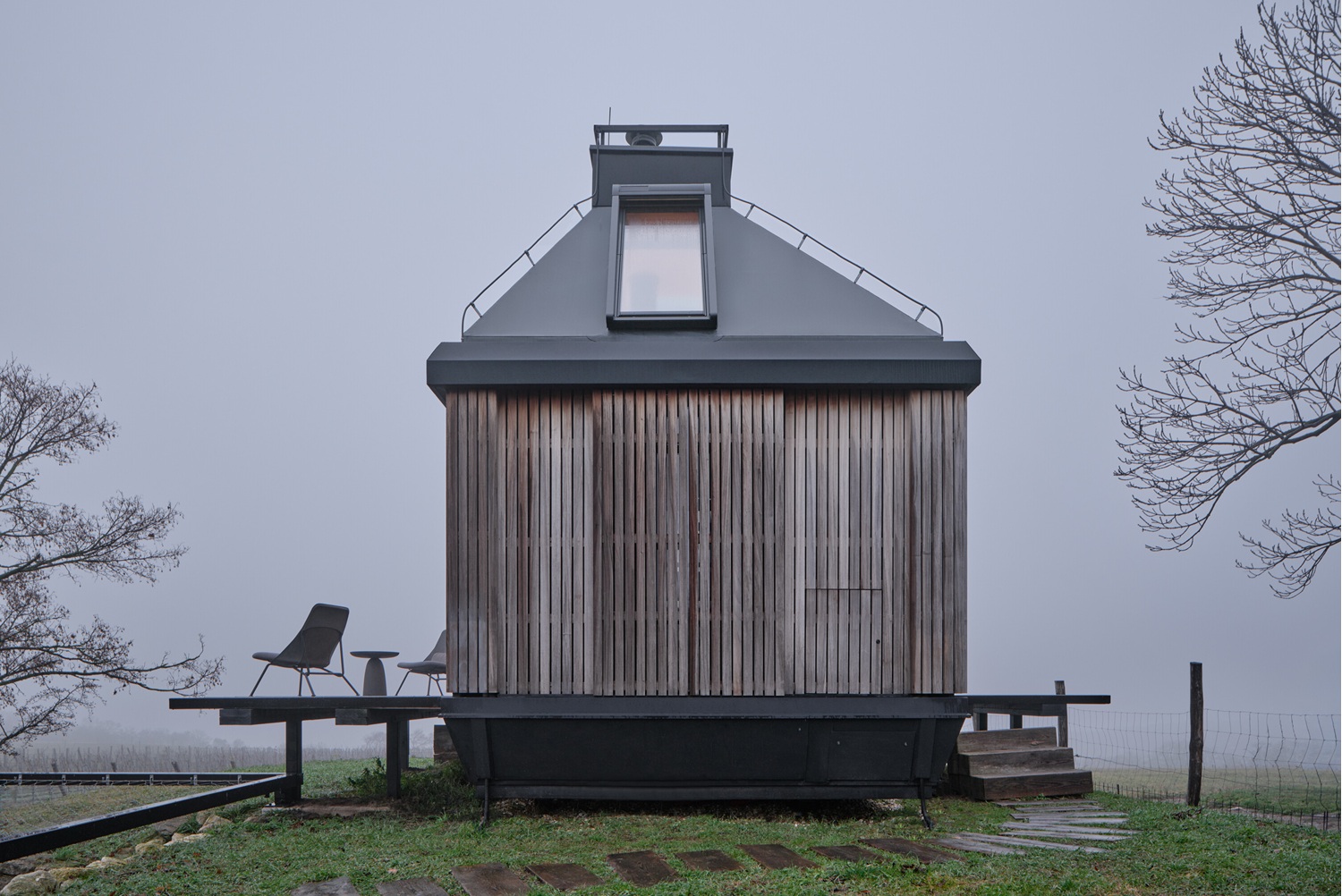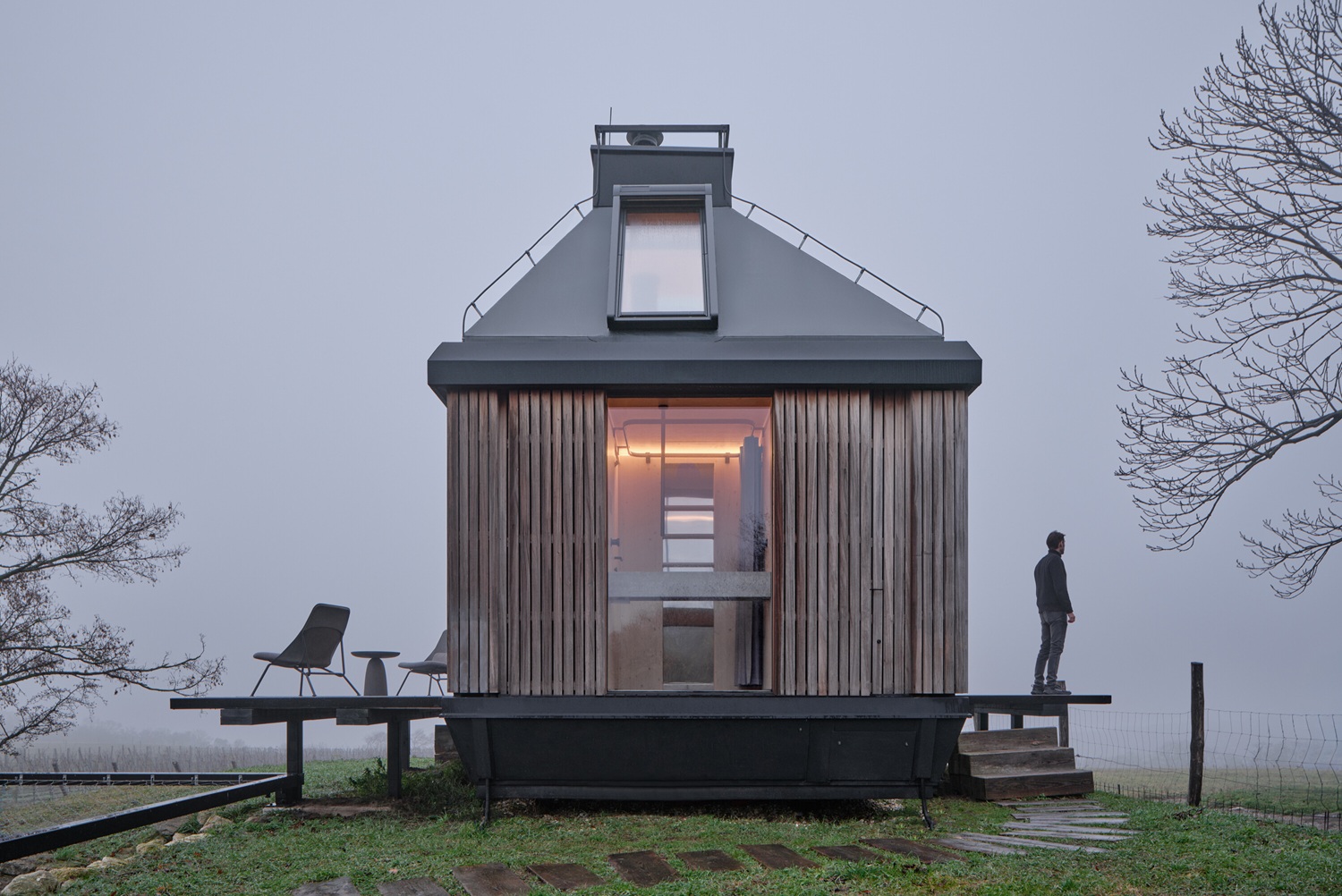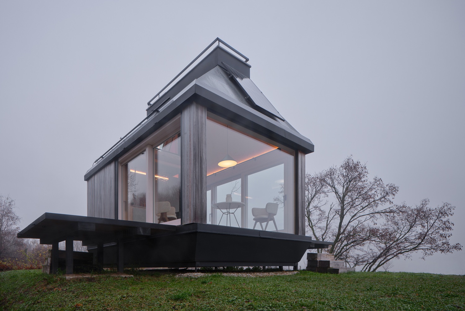 Cabin Devín je energeticky soběstačné víkendové bydlení, které v roce 2024 vyrostlo v okrajové části Bratislavy. Dvě otevíravé fasády a transformační prvky umožňují rozšířit interiér směrem do krajiny a měnit ho z kompaktního útočiště v otevřený pavilon s panoramatickým výhledem na děvínské vinice.