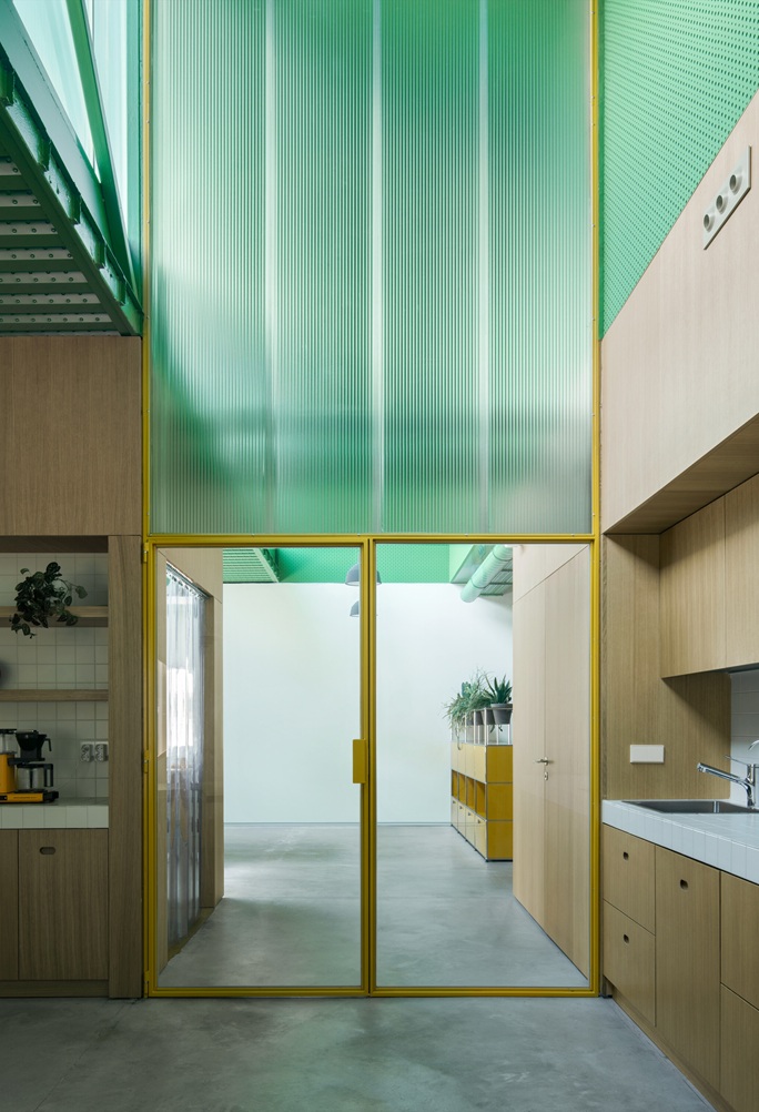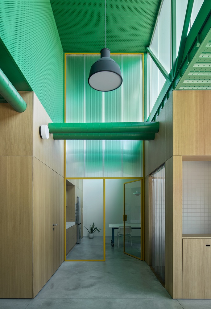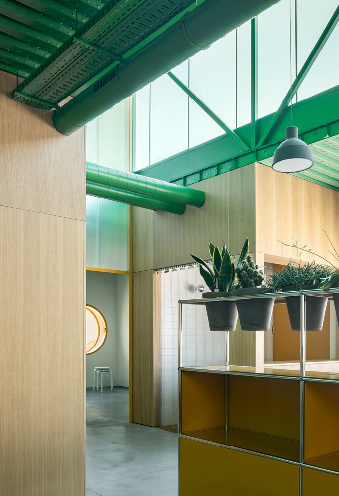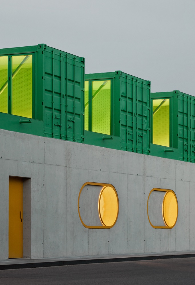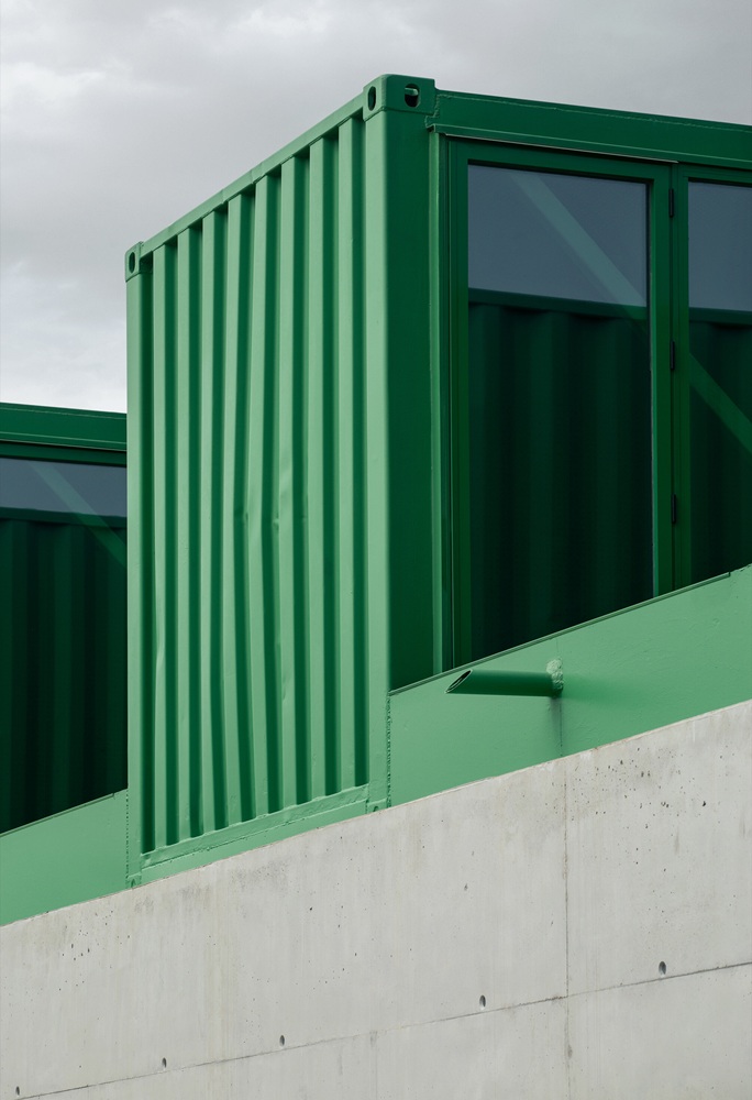 Prostorové uspořádání budovy vychází z jasného a opakovatelného systému. Čtyři znovu použité přepravní kontejnery, otevřené podél dvou stran, spočívají na betonovém soklu sdíleném s přilehlými průmyslovými sklady. Jejich uspořádání vytváří pilovitý profil střechy, který funguje jako sled světlíků a do interiéru přivádí měkké, rovnoměrné denní světlo, čímž vytváří překvapivě bohatou prostorovou atmosféru. Přísun přirozenného světla zajišťují také severně orientované otevřené plochy.