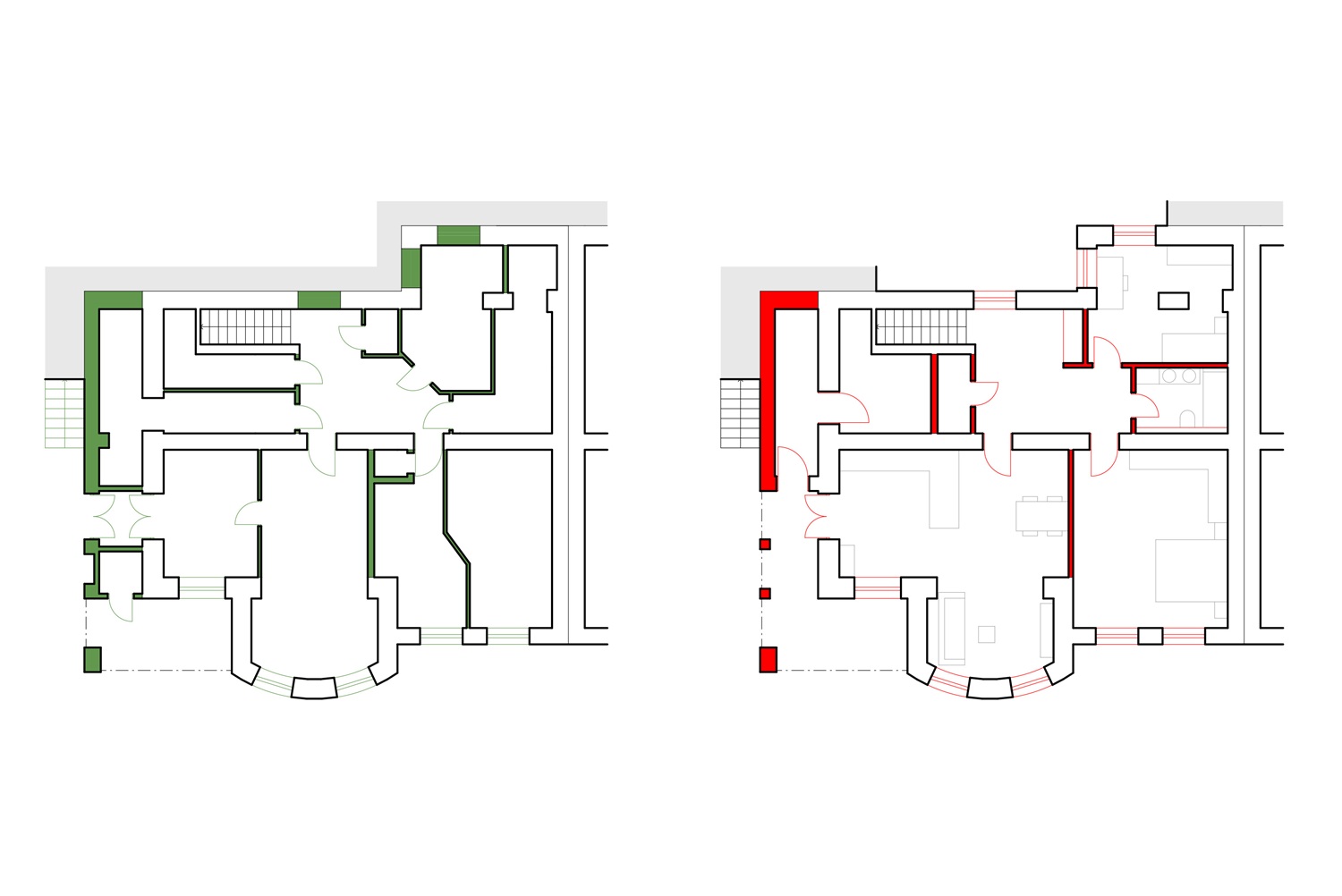 Suterénní byt je oproti původnímu stavu přisvětlen novým anglickým dvorkem a na něj navazujícími nově vloženými okny. Přístupný je jak přímo z jižní zahrady, tak i po schodišti ze severní zahrady na úrovni přízemí.