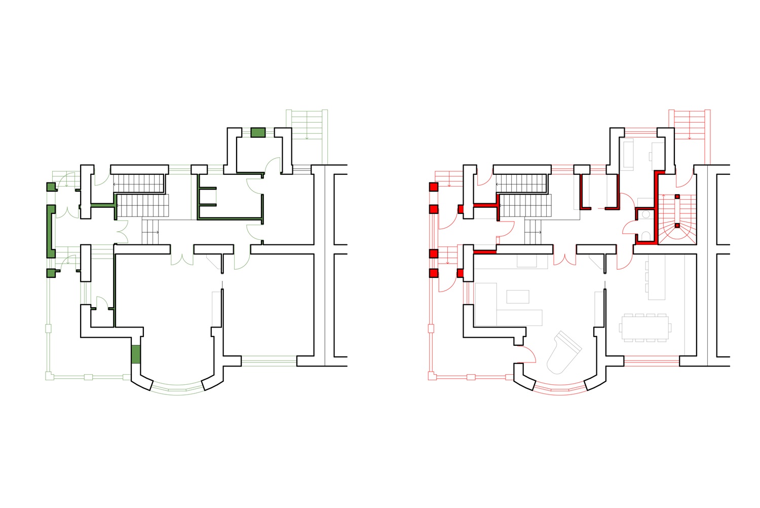 Na rozdíl od suterénu a podkroví, kde byly dispoziční změny zásadní, nebylo v přízemí a patře nutné přistupovat k tolika změnám. Počet i velikost místností zůstaly obdobné, došlo pouze k doplnění koupelen a zázemí. Obývací pokoj a kuchyně hlavního bytu jsou odděleny příčkou s původními posuvnými dveřmi, navazujícími na skříň s vitrínami. Celá tato sestava byla zachována a prošla důkladnou renovací. Podobně autoři rekonstrukce přistoupili k vnitřním dveřím, které sice nebylo možné restaurovat, byly ale vyrobeny jejich přesné kopie.