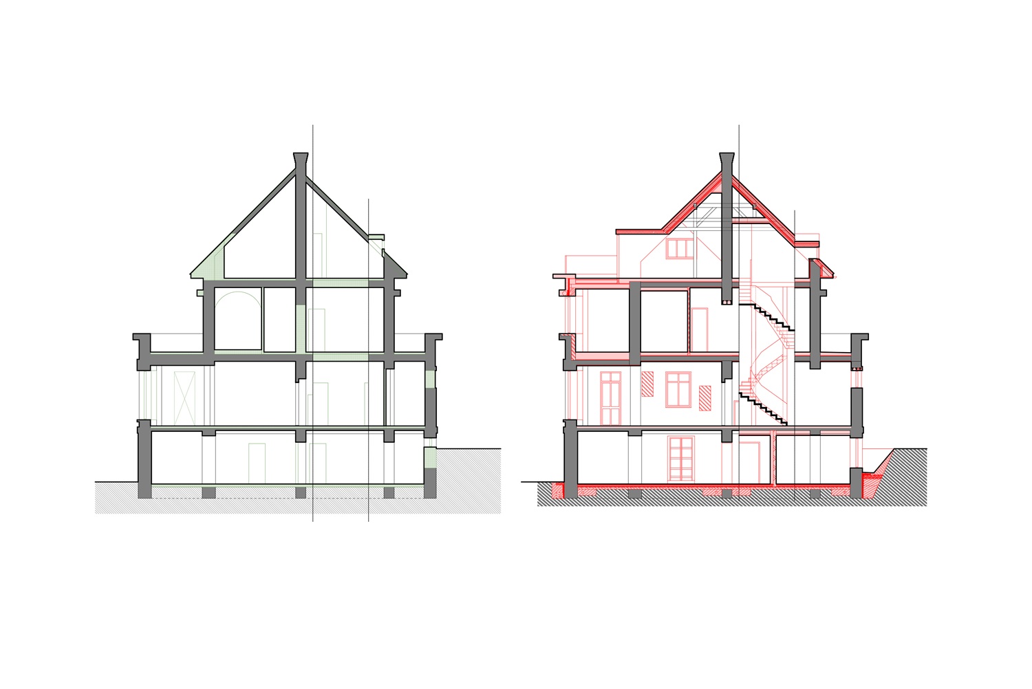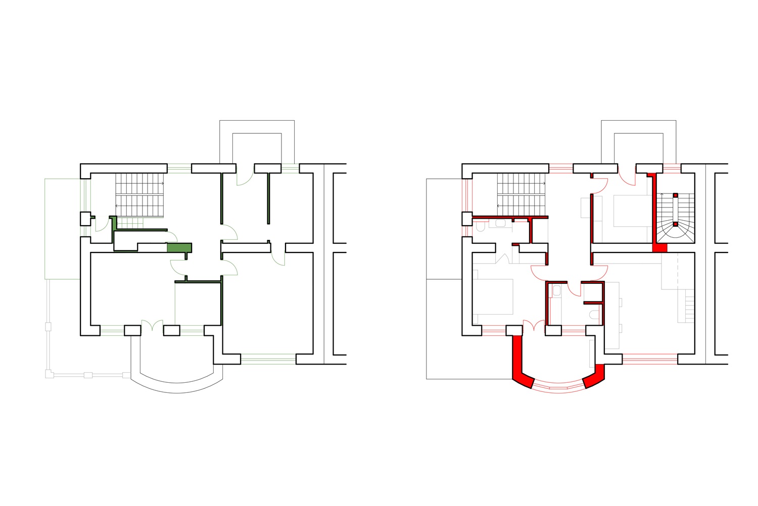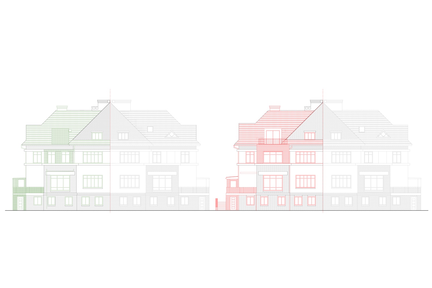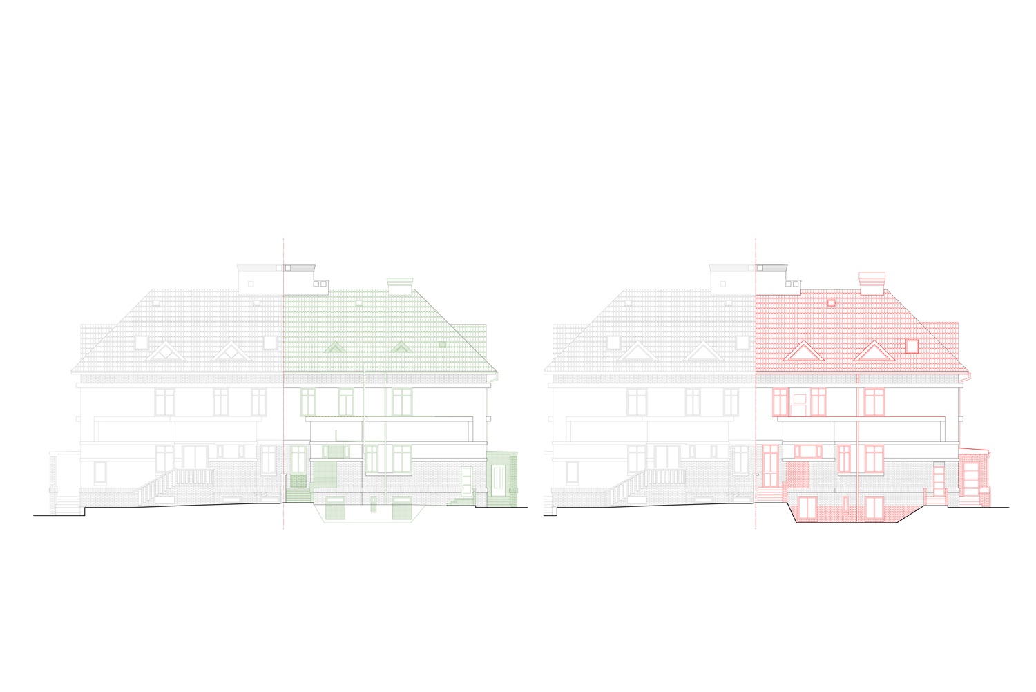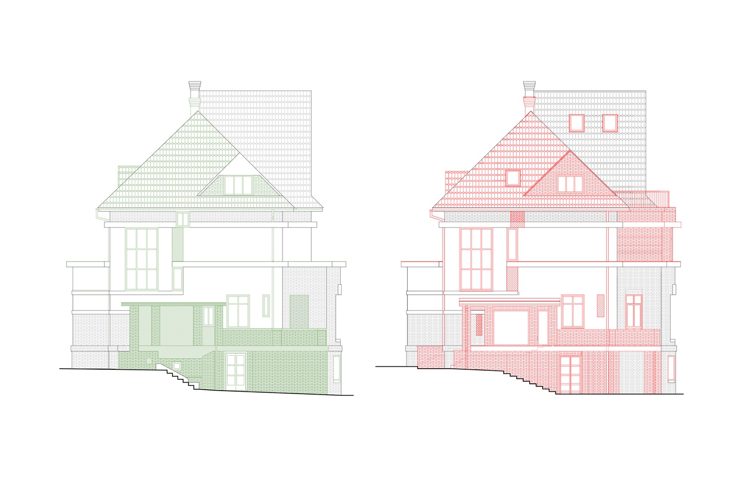 Investorův požadavek na přístavbu místnosti nad původní terasu byl předmětem mnoha diskuzí. Výsledné řešení nenápadně doplňuje stávající strukturu, přesto několik detailů napovídá, že jde o novodobý zásah – například vynechání korunní římsy či zapuštěný výstup na střechu nástavby v úrovni podkroví.