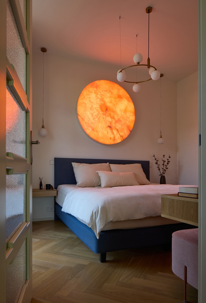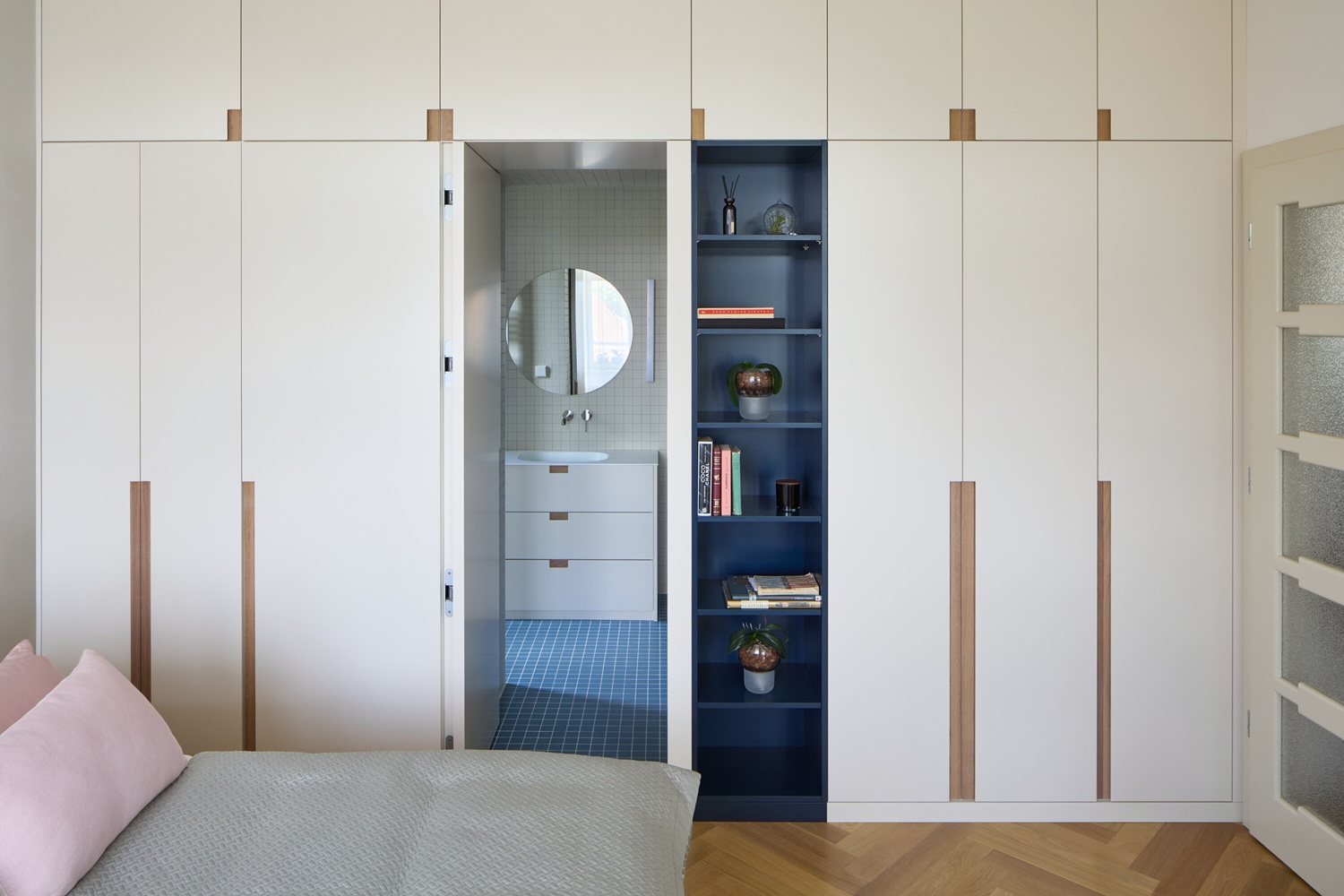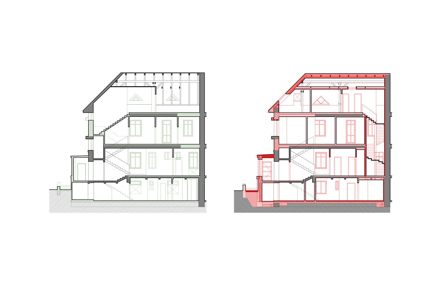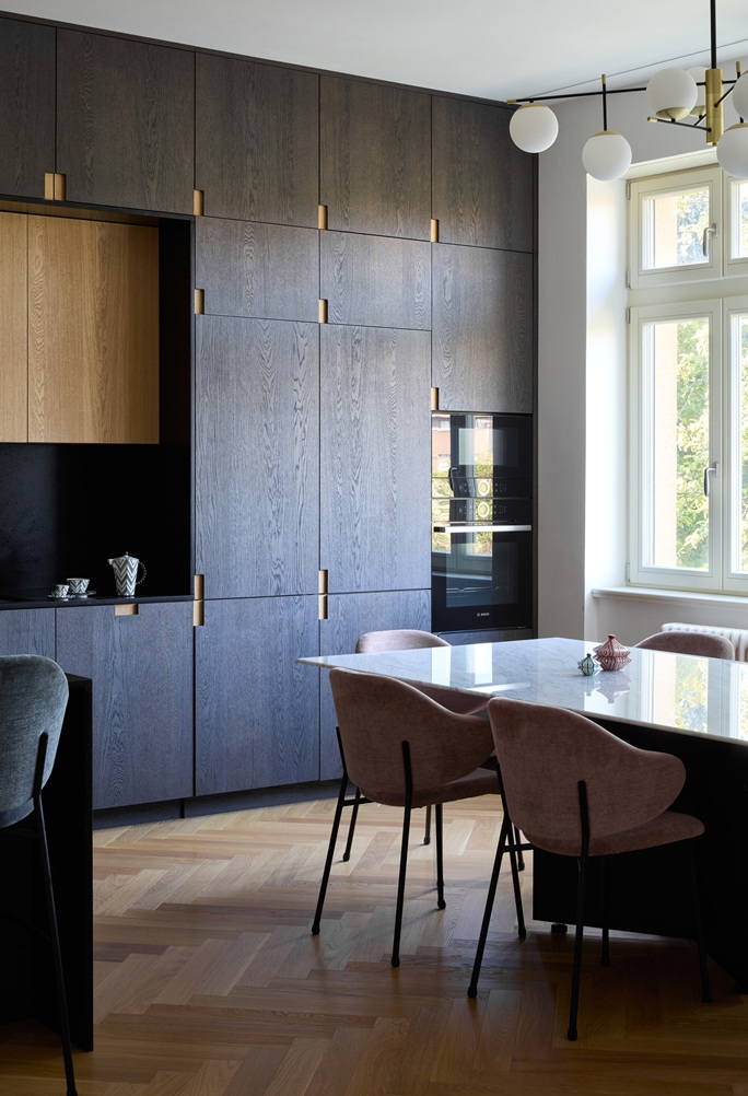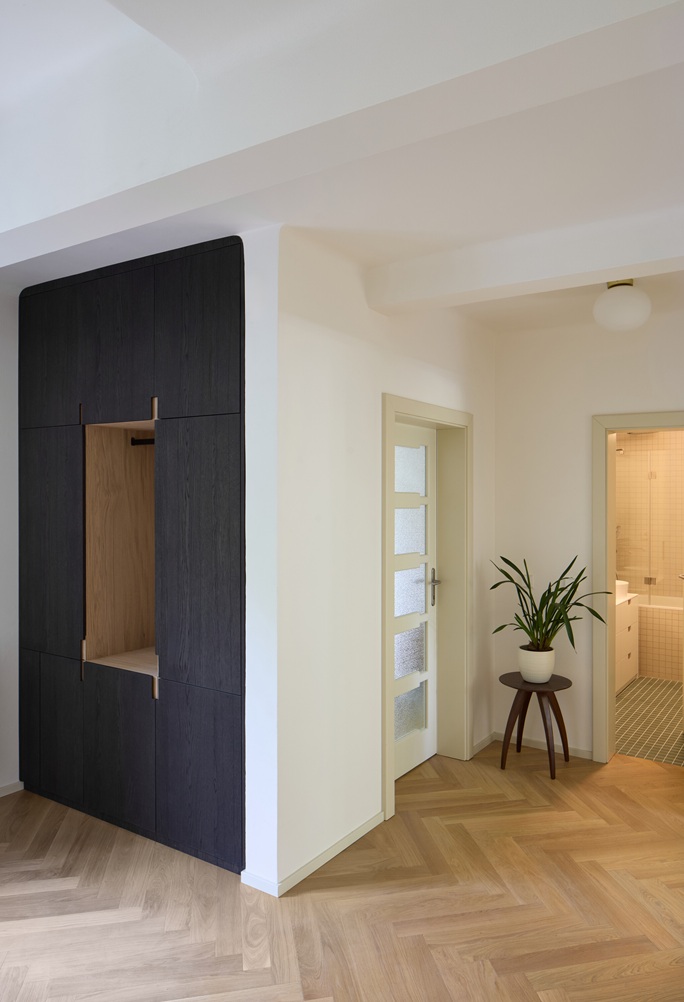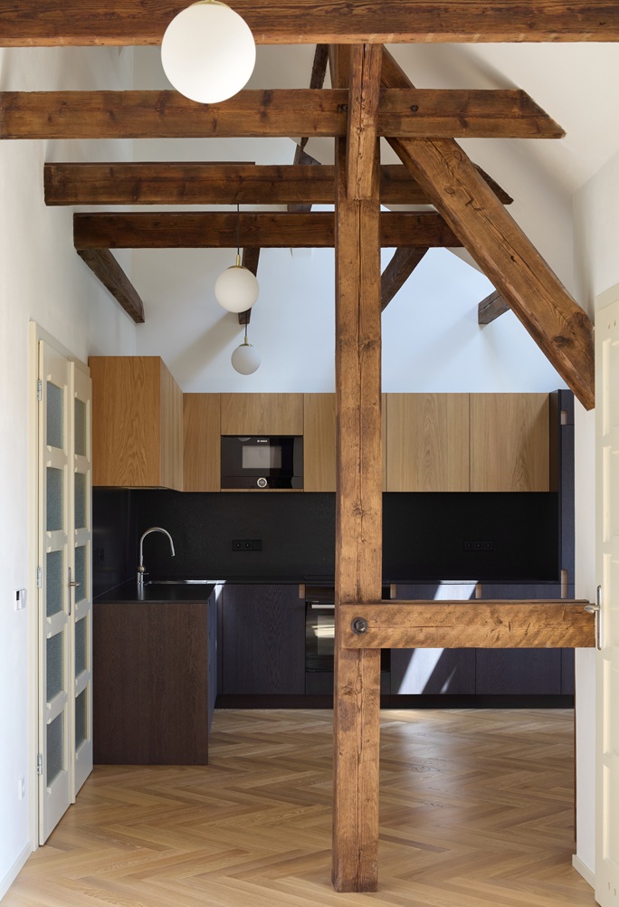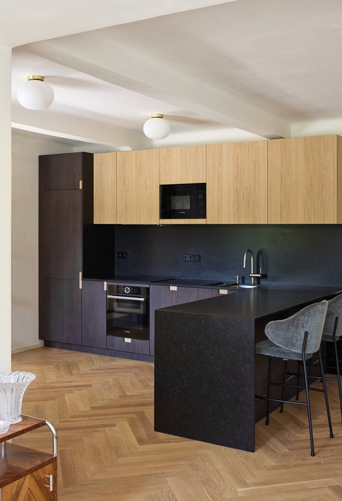 Při studiu původního stavu a během odkrývání historických vrstev při bouracích pracích fascinovala architekty nutnost propojit staré a nové prvky. Objekt byl v natolik špatném stavu, že v interiéru bylo možné zachovat jen minimum. To zároveň přineslo možnost sem citlivě vložit nové prvky. Veškerý vestavěný nábytek byl navržen autory z Atelieru Hajný tak, aby působil moderně a nadčasově, ale s odkazem na historii domu a poctivé řemeslo. Tmavé plochy jsou potaženy mořenou dubovou dýhou, zapuštěné úchytky jsou ručně opracované z dubového masivu. Součástí návrhu je i výběr volně stojícího nábytku od firmy Modernista, která se specializuje na přesné repliky českého kubistického, funkcionalistického a artdecového nábytku.