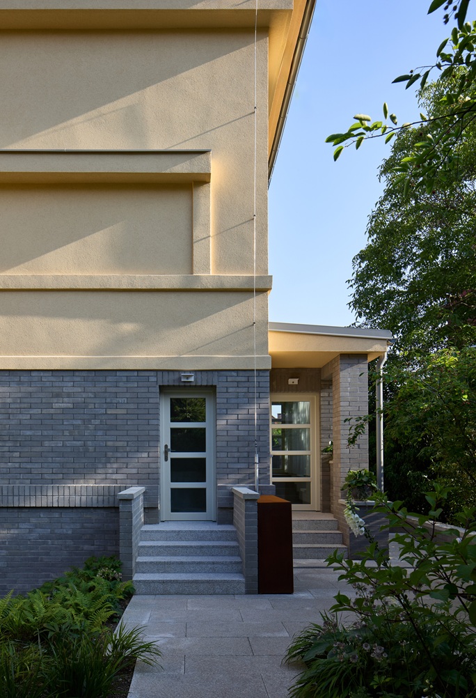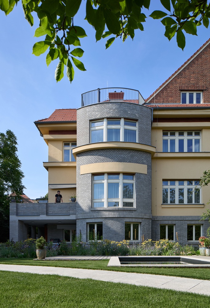 Pro exteriér vily byly typické plochy z betonových cihel, z nichž je kompletně zrealizována fasáda novostavby garáže. Na samotné vile byly původní cihly ve velmi špatném stavu a jejich obnova byla nereálná. Po konzultaci s památkáři zakryli architekti původní cihly novou, dvoucentimetrovou vrstvou cihelných pásků řezaných na místě z celých betonových cihel.