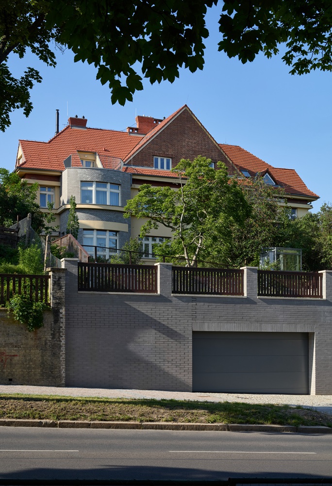 Původní garáž zapuštěná v terénním zlomu nevyhovovala staticky ani velikostně, a proto ji nahradila větší železobetonová konstrukce. Ta zároveň slouží jako opora pro zahradu, která na střechu garáže přechází. Garáž a zahrada jsou pro větší pohodlí propojeny výtahem na úrovni přízemí.