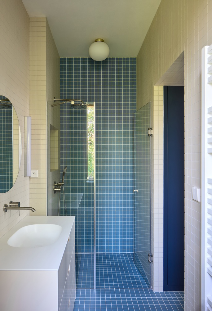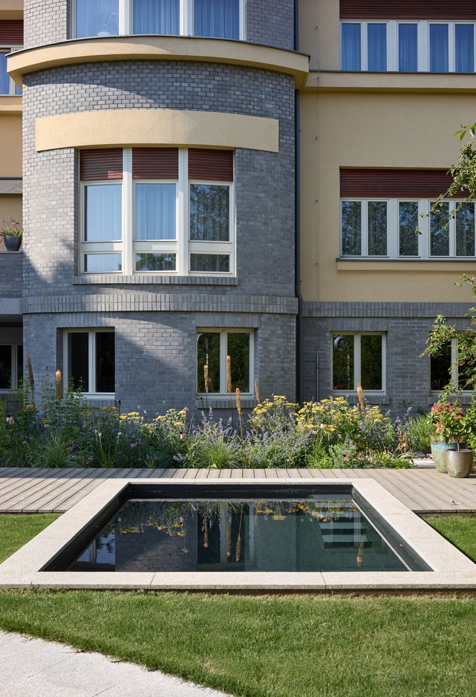 Dialog starého a nového se promítá do mnoha vrstev návrhu – od typu parket a historických okenních profilů s izolačními skly přes tradiční barvu slonové kosti na vestavěném nábytku až po ukrytí podlahového teplovodního vytápění napojeného na tepelné čerpadlo země–voda. Pod garáží jsou umístěny dva vrty o hloubce 200 metrů.