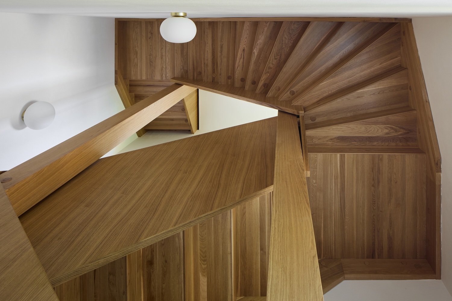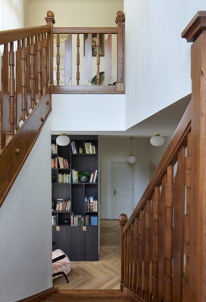 Vnitřní schodiště hlavního bytu bylo zbaveno dřevomorky, zrenovováno a ponecháno na svém místě u převýšeného okna, které směřuje do zahrady a vnáší do interiéru západní světlo.