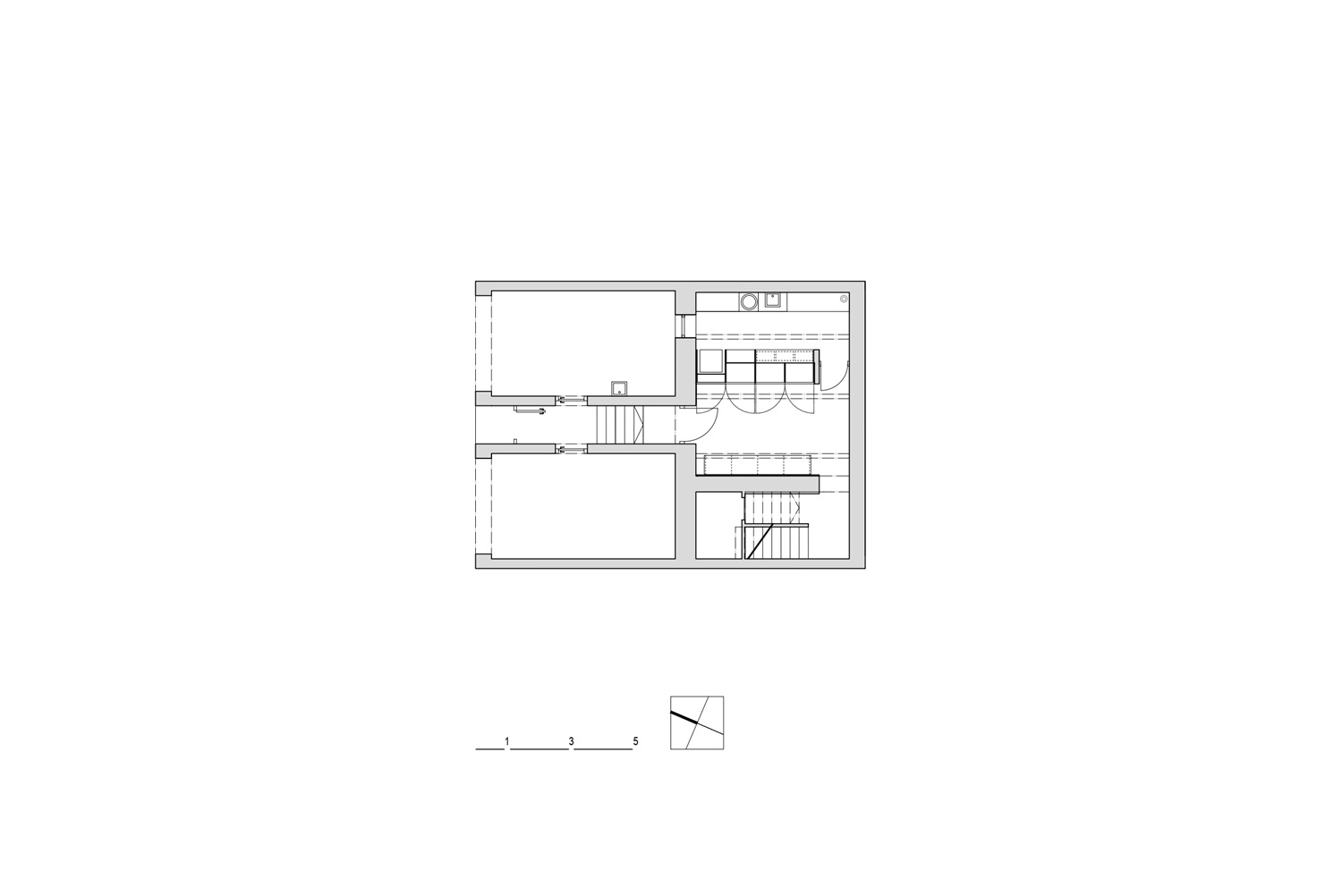 Vnitřní členění domu bylo upraveno výrazně. Vstup na nejnižší úrovni domu byl celkově zvětšen a prosvětlen díky proskleným dveřím, odstraněním podhledů a proměně materiálů i barev. V přízemí jsou v kontaktu se zahradou hlavní prostory: obývací pokoj, kuchyň s jídelnou a ložnice s koupelnou. Pro tu se podařilo vyšetřit místo zmenšením průchodu na zahradu a drobnými souvisejícími změnami. V patře se prostory, které dříve sloužily jako dětské pokoje, proměnily v „salon“ pro setkávání rodiny při slavnostních příležitostech a současně v domácí kinosál a pokoj pro hosty. Zásadní proměnou prošlo také podkroví, jež nyní umožňuje i delší pobyt hostů, aniž by bylo narušeno jak jejich soukromí, tak soukromí hostitelů.