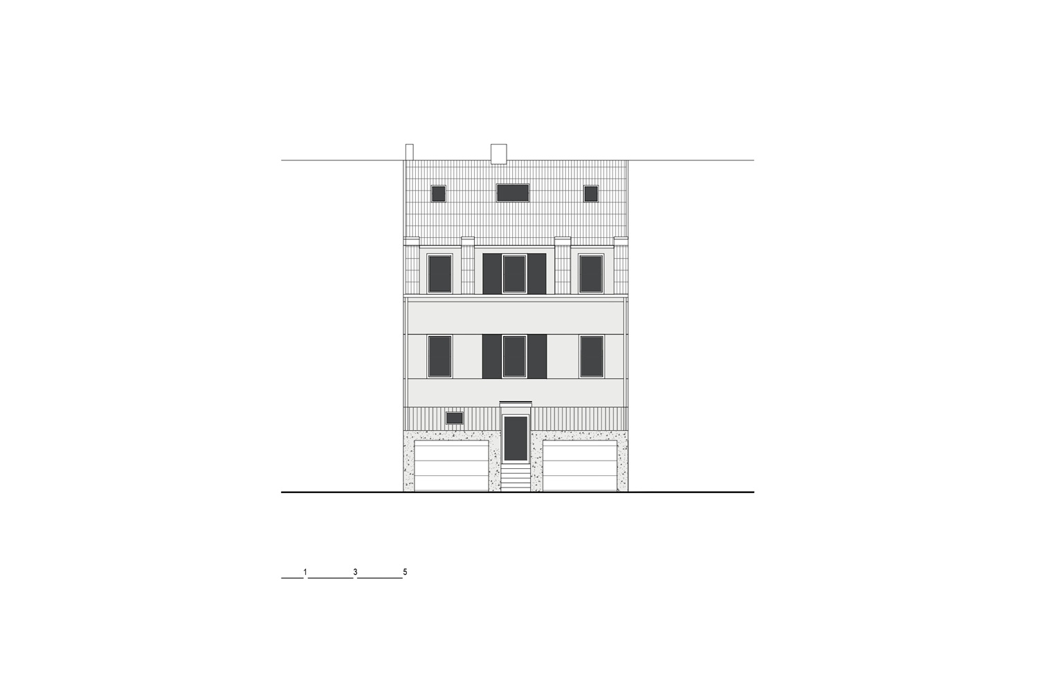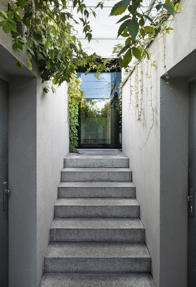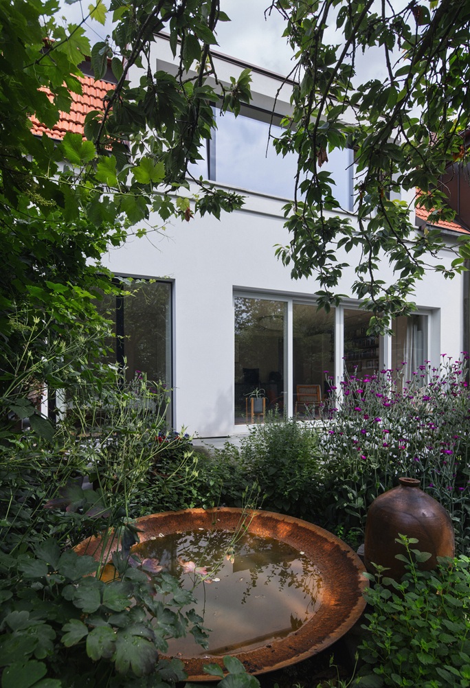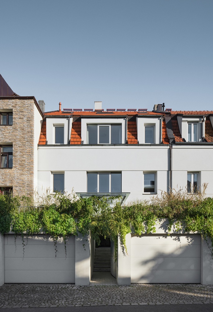 Navenek nedává dům zásadní rekonstrukci vnitřních prostor příliš znát. Barevně tlumená fasáda, kombinující jemnozrnnou a hrubou omítku se vstřikovaným kamenným zrnem, zklidnila jeho celkový výraz. Soudobé řešení oken nahradilo historizující členění a výrazně prosvětlilo interiér. Okna různých konstrukčních a materiálových řešení – dubová, s překrytím vnějším sklem, bezrámová nebo s bělenými smrkovými rámy – přímo reagují na charakter jednotlivých místností. Rozsah původních a současných oken dává tušit jejich materiál. Nejvýrazněji se do exteriéru propsaly dispoziční úpravy patra, kde velkorysý vikýř s bezrámovým zasklením směrem do zahrady nahradil původní dva malé.