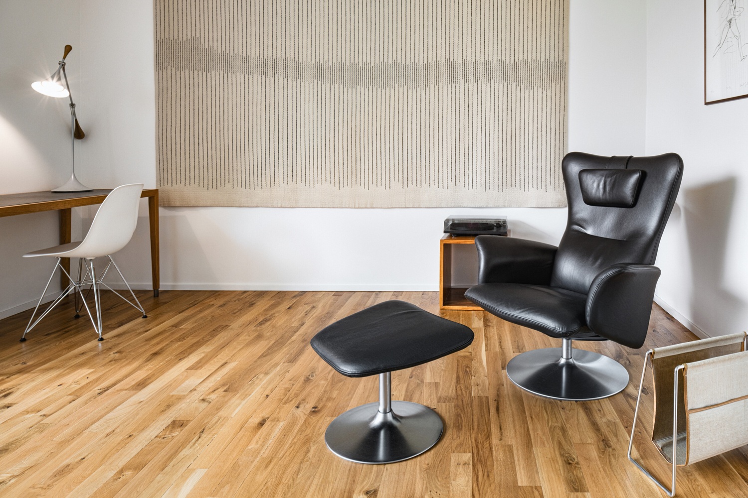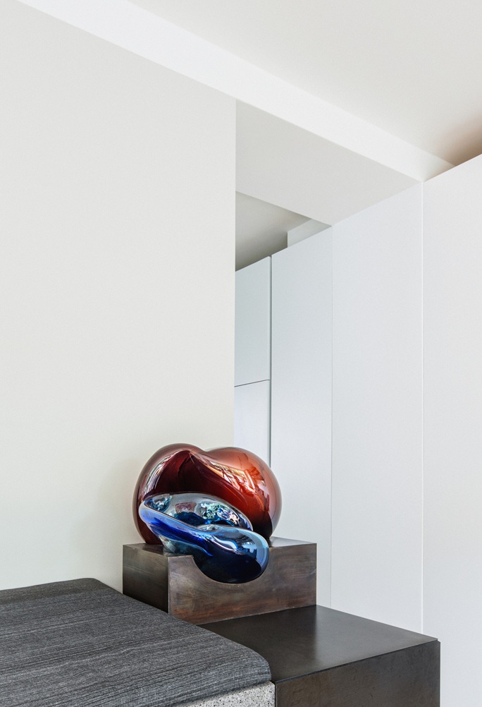 V interiéru jsou ponechány a doplněny některé původní prvky, například pozinkované zábradlí, které propojením na hlavních a vedlejších podestách jednotlivých ramen získalo „neprašovský“ charakter. Renovovány a doplněny byly původní parkety a podlahové „lišty“ z pozinkovaného plechu. Stěny v bílé a šedé dávají vyniknout obrazům, část je obložena překližkou v přírodním tónu. Také koupelny byly změněny jak prostorově, tak celkovým laděním. Bílé velkoformátové obklady (3 × 1 m) doplňuje teracová dlažba a truhlářské kusy z dubového masivu. Původní vnitřní dveře s nadsvětlíky prošly renovací, nové jsou provedeny se skrytými zárubněmi.