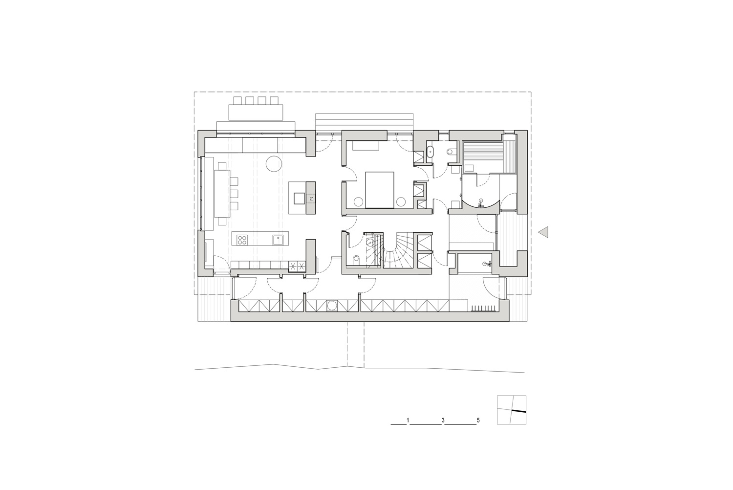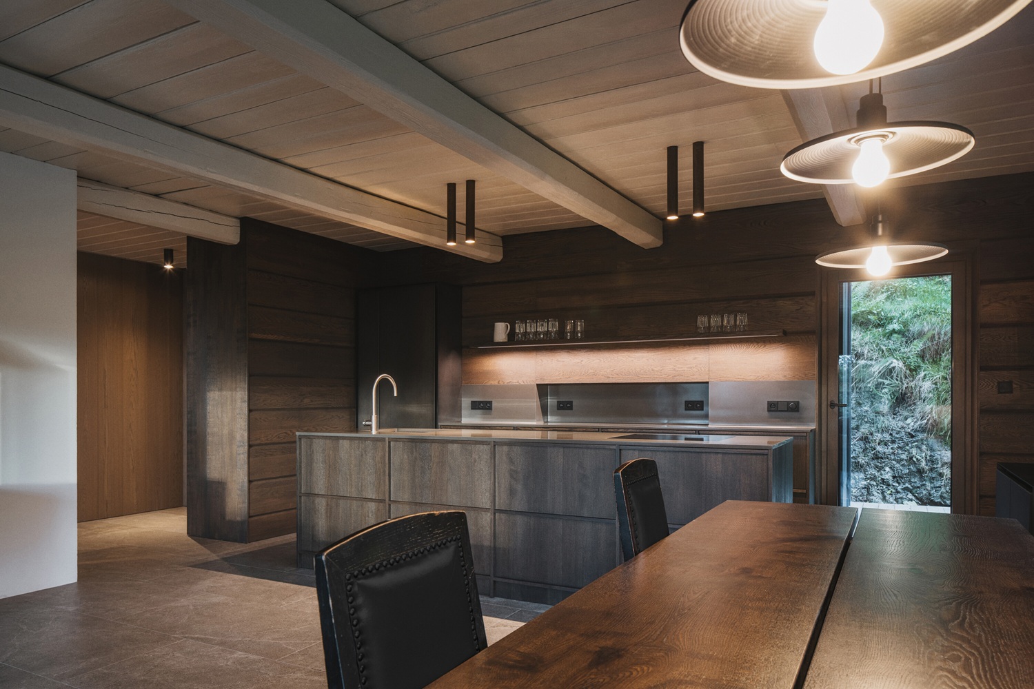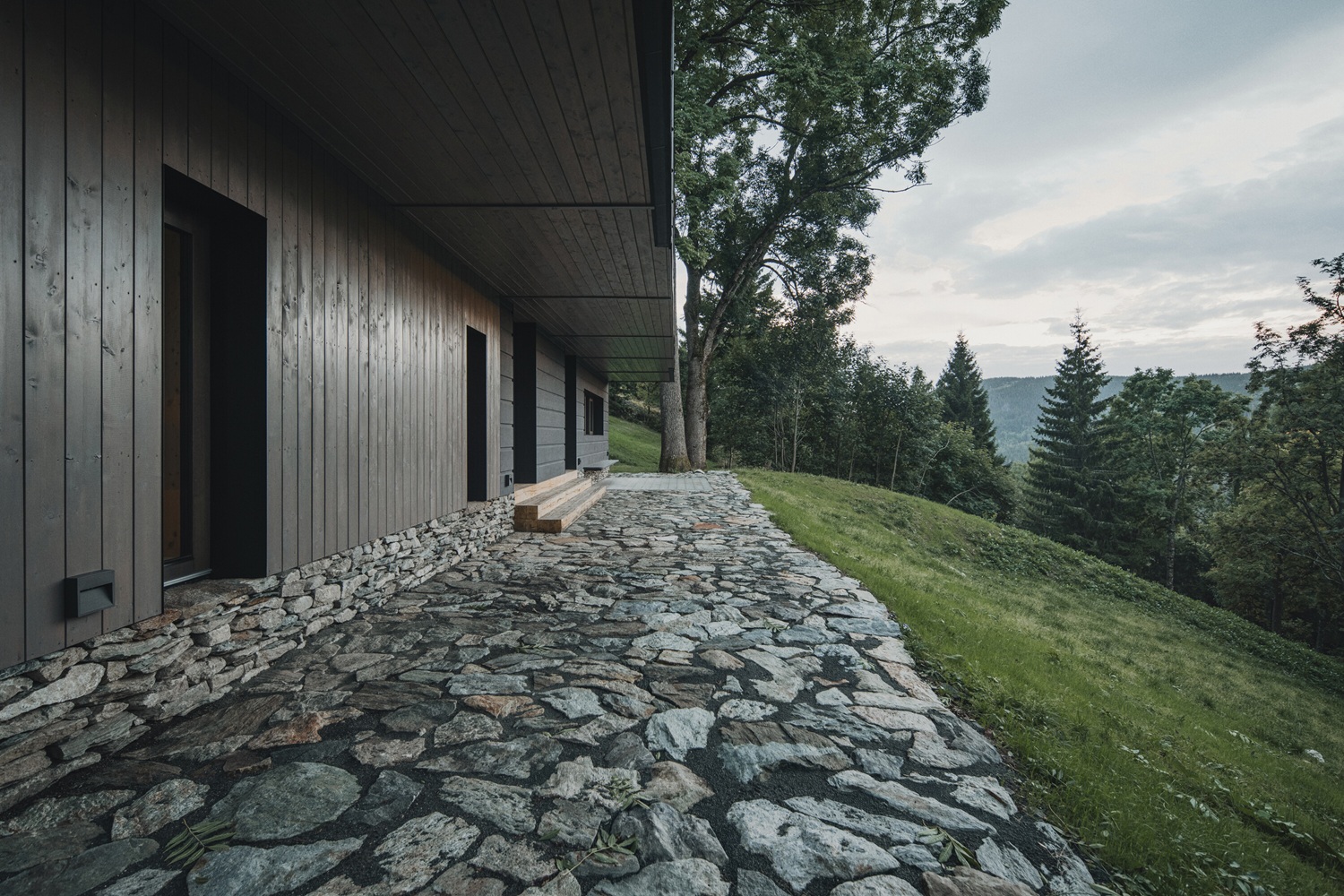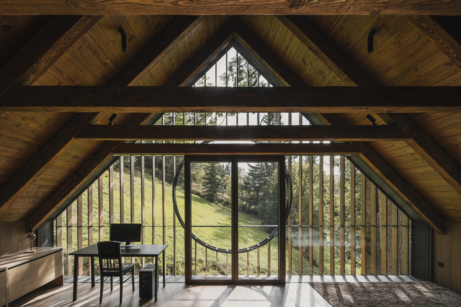 Krkonošské stavby charakterizují mohutné, strmé střechy, které kdysi svým obyvatelům umožňovaly přežít dlouhé zimy. Typické pro ně byly i seníkové vikýře, asymetrická nasazení střech na nízkém roubení vytvářejícím zápraží, deštění ve štítech, kamenné podezdívky a dispoziční trojdělení. A právě takovou chtěli architekti vrátit na místo, kam patří. Cílem jejich návrhu bylo vytvořit autentickou atmosféru chalupy, aniž by se uchýlili k začlenění historizujících prvků bez jakékoli skutečné historické hodnoty. Nesnažili se vměstnat do tradičního objemu soudobé prostorové principy, ale spíše naopak – vytvořit soudobou stavbu při využití tradičních prostorových principů. Ve světnici tak zůstala zachována atmosféra uzavřeného, bezpečného, intimního prostoru. Její dimenzi – a následně i měřítko dalších místností – určil jeden z mála dochovaných prvků: trámový strop. Ten předurčil světlou výšku i celkovou proporci prostoru. Díky kombinaci otevíravých a bezrámových zasklení zůstal zachován rytmus tradiční stavby v exteriéru i interiéru a zároveň se interiér otevřel výhledům do krajiny.