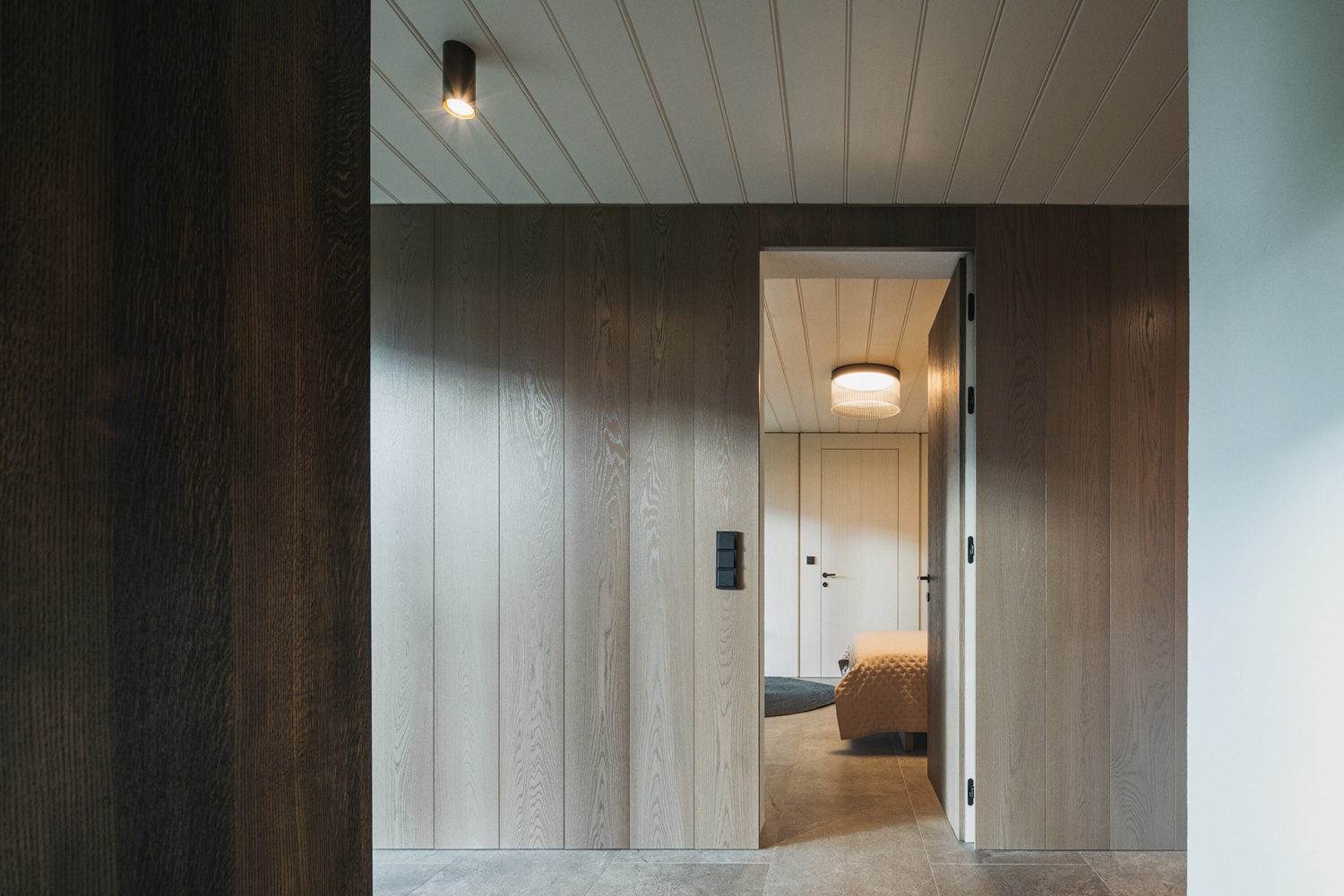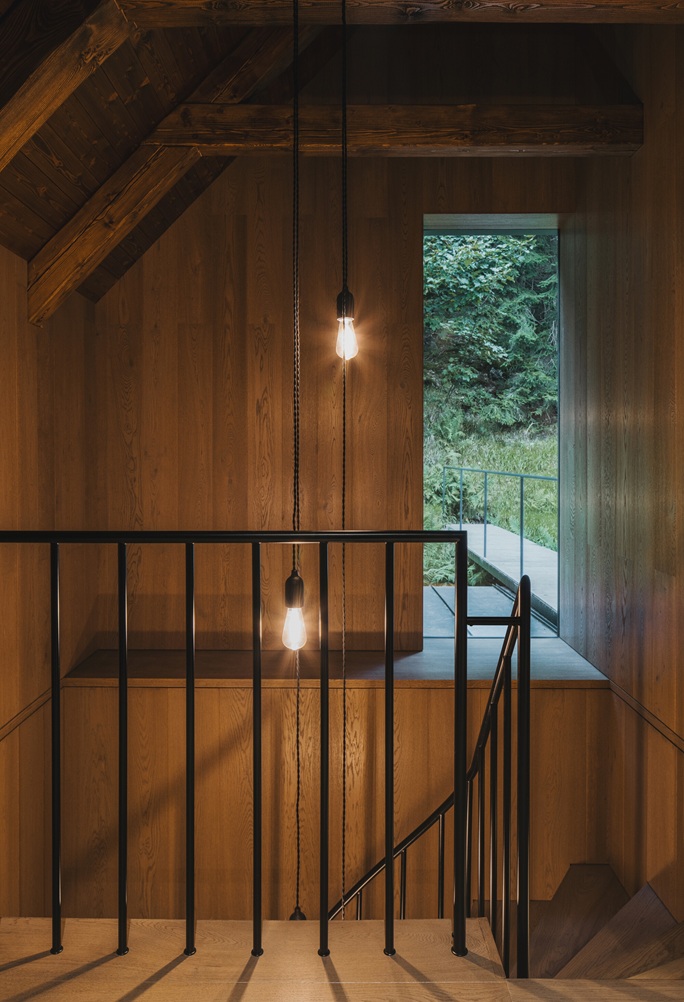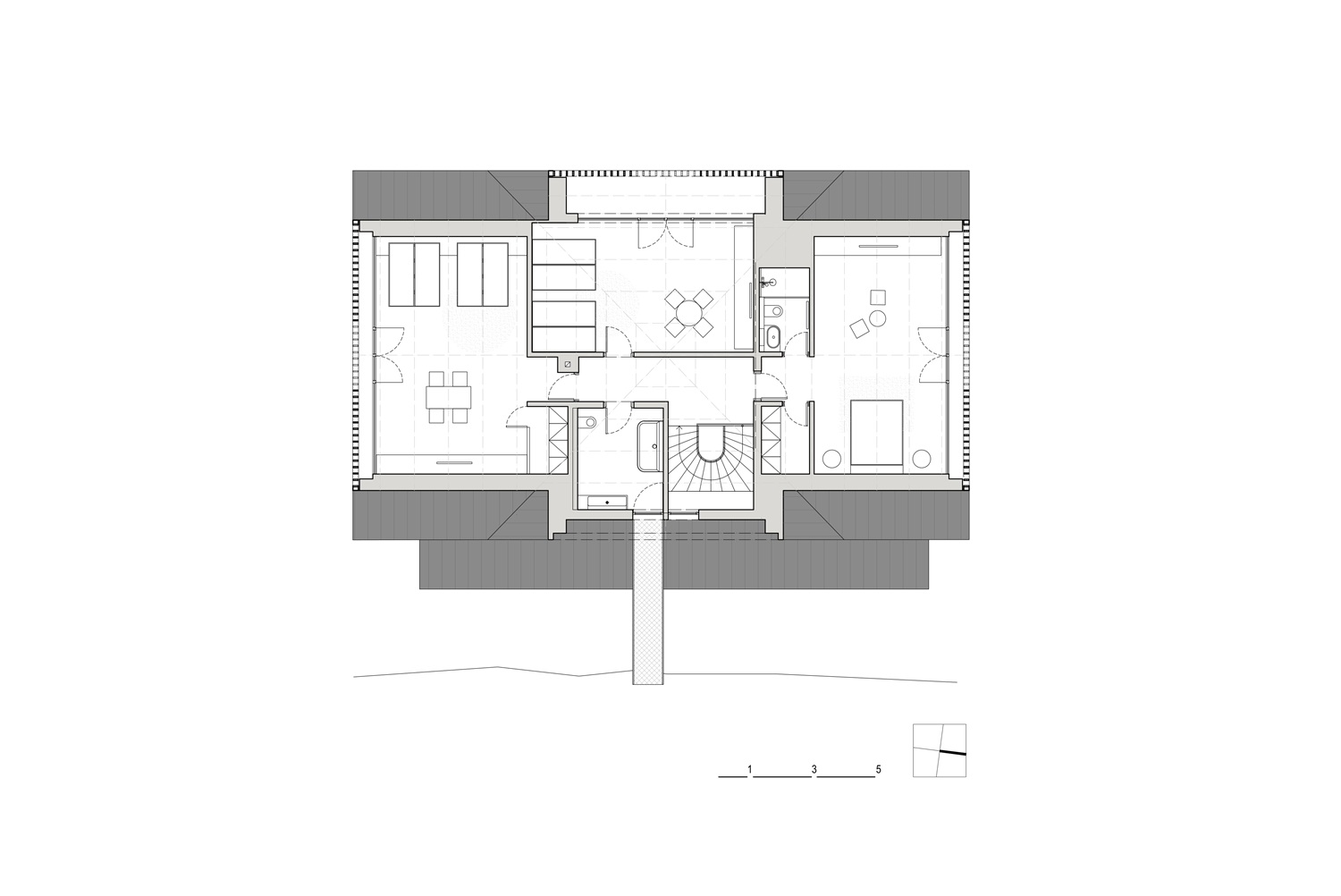 Právě světnice, s pohodlným sezením pod okny a velkým stolem, je srdcem celého přízemí. Do objemu původní chalupy je dále vložen pokoj pro hosty a schodiště. Toalety přistavěné za socialismu se proměnily v saunu se zázemím. Mezi svah a původní objem chalupy je vloženo skladové a technické zázemí pro vše, co se na horách může hodit – spíž, prádelna, vybavení pro lyžování a cyklistiku, dílna, technická místnost a umývárna pro psa a kolo v jednom. Podkrovní prostory jsou v duchu původních podstřešních prostor velkoryse otevřeny a poskytují soukromí jednotlivým členům rodiny. Pokoje ve štítech nabízejí výhledy na hřebeny Krkonoš.